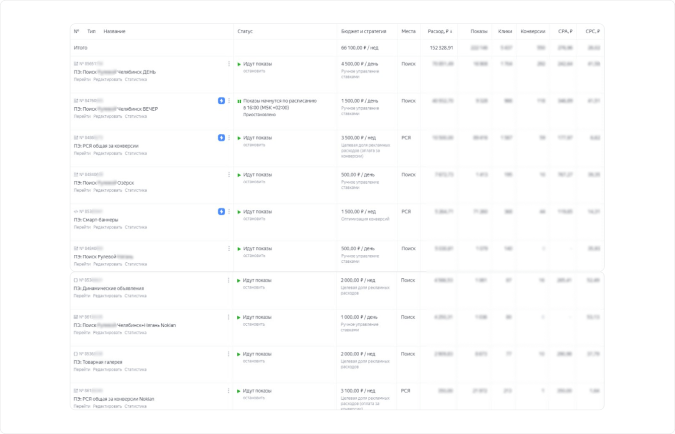 — 4 поисковые кампании на Челябинск — день и ночь, А также, на Озерск и Нягань. Это помогло выдержать требование клиента о разном расходе: на Челябинск — 85%, Озёрск — 5%, Нягань — 10%.