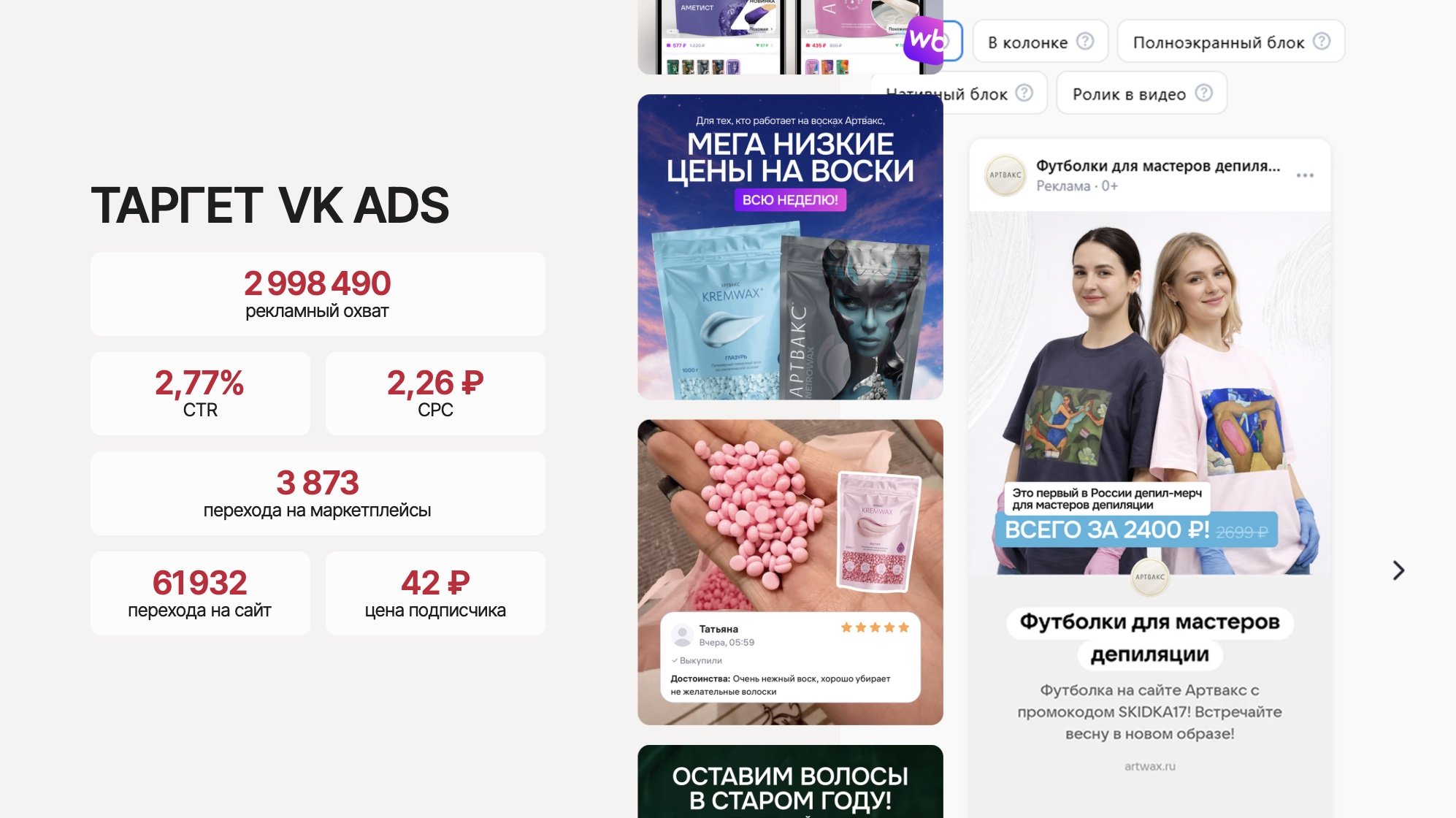 С ноября мы тестируем и ищем самую выгодную связку таргета с маркетплейсами и таргета с сайтом, где продается первый в России депил-мерч от бренда.