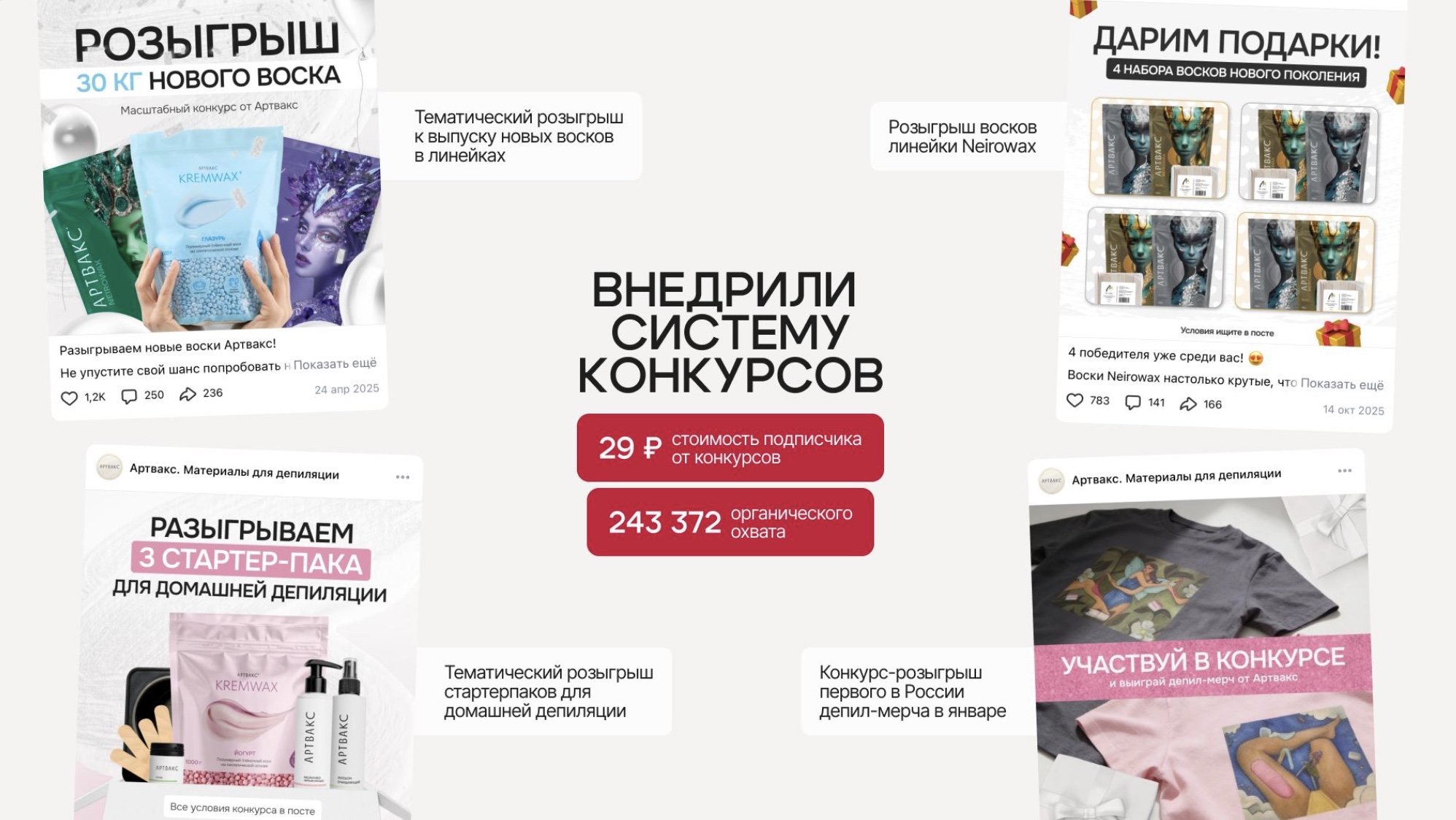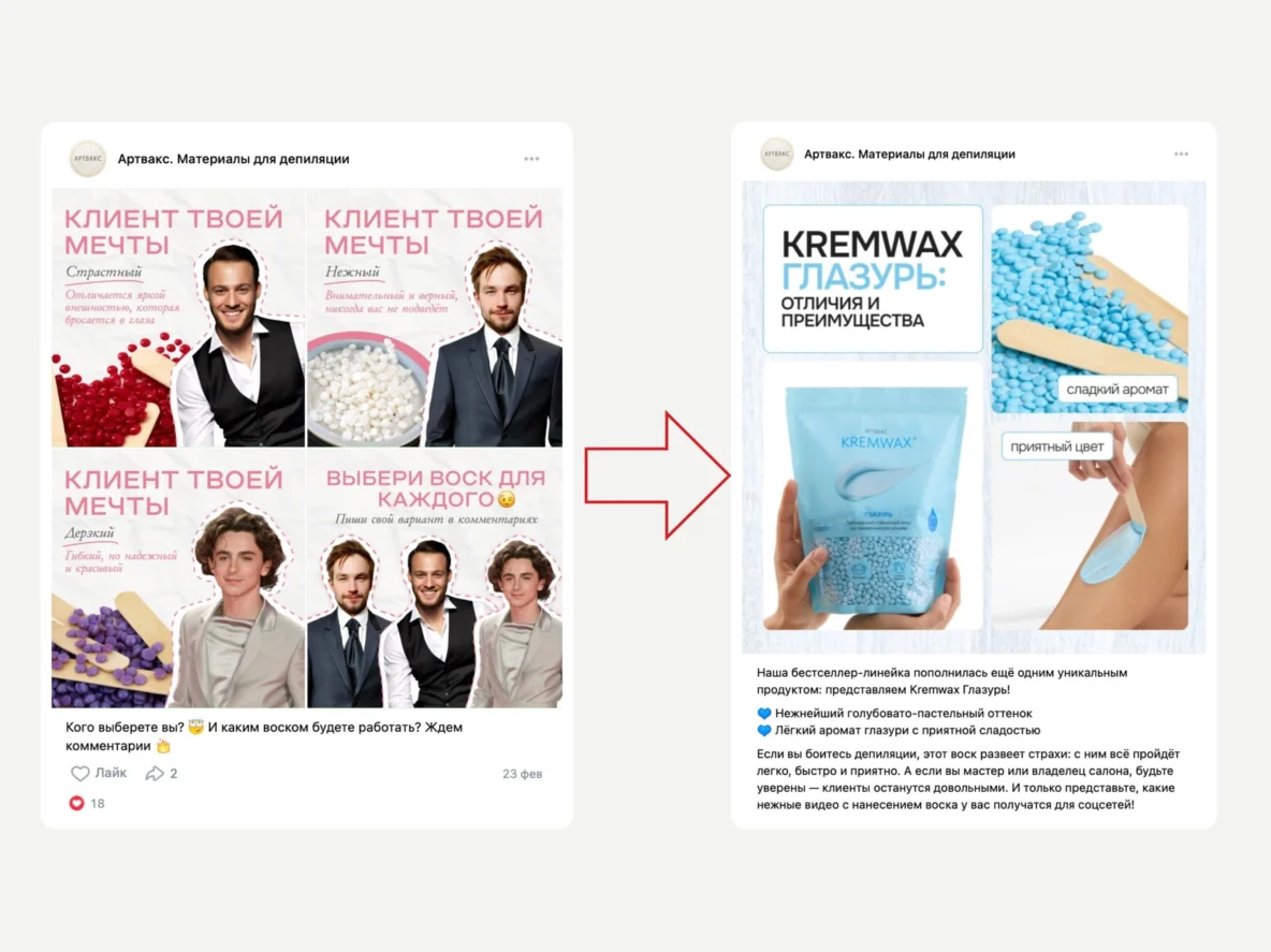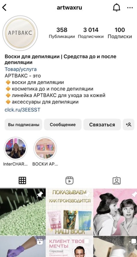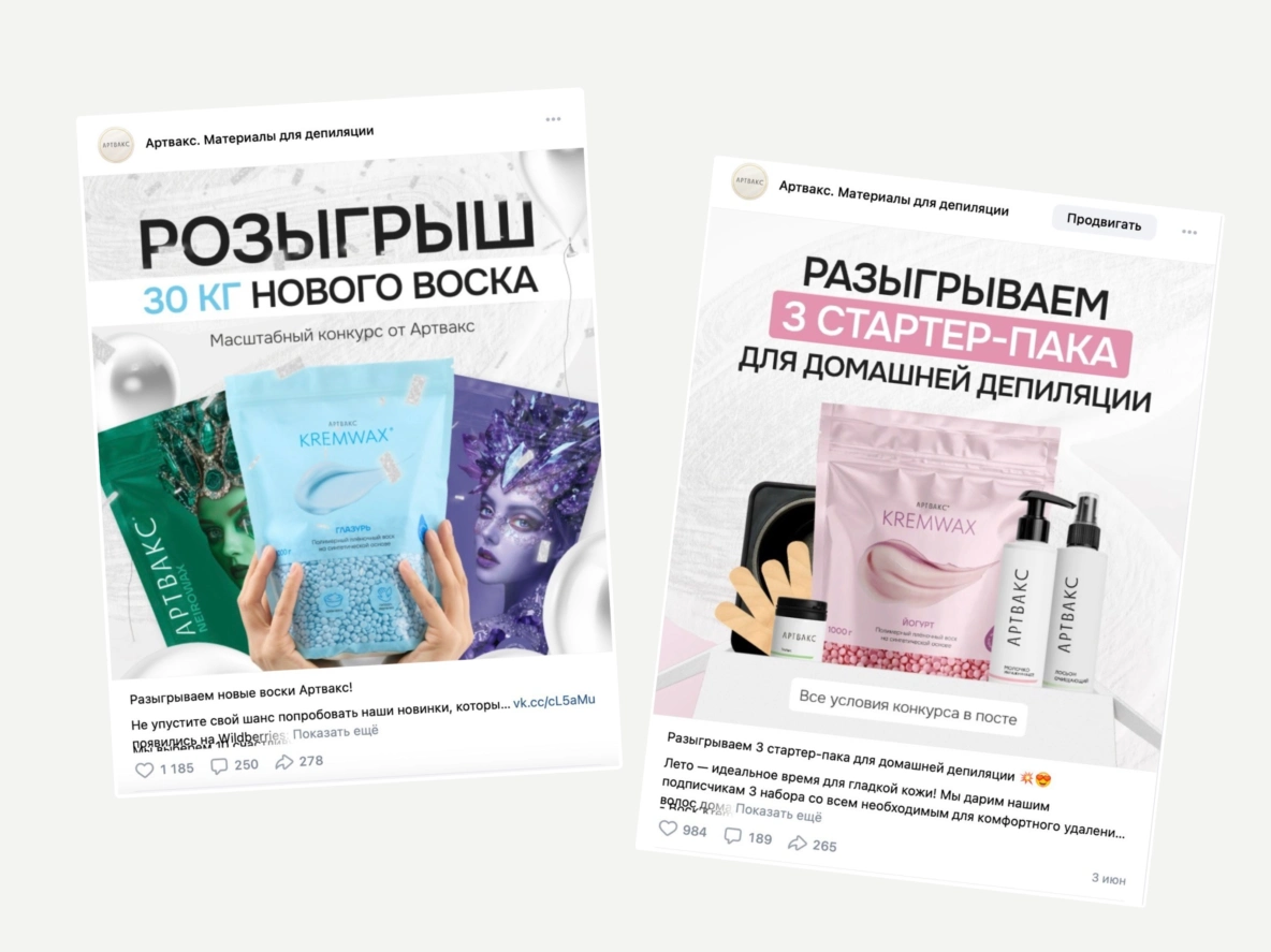 На момент марта 2025 у Артвакс был стандартный контент — посты о скидках, обзоры продуктов, прямые эфиры. Но живого общения с аудиторией было мало. При этом бренд имел сильное конкурентное преимущество — одну из самых низких цен на воск за 100 грамм на рынке.