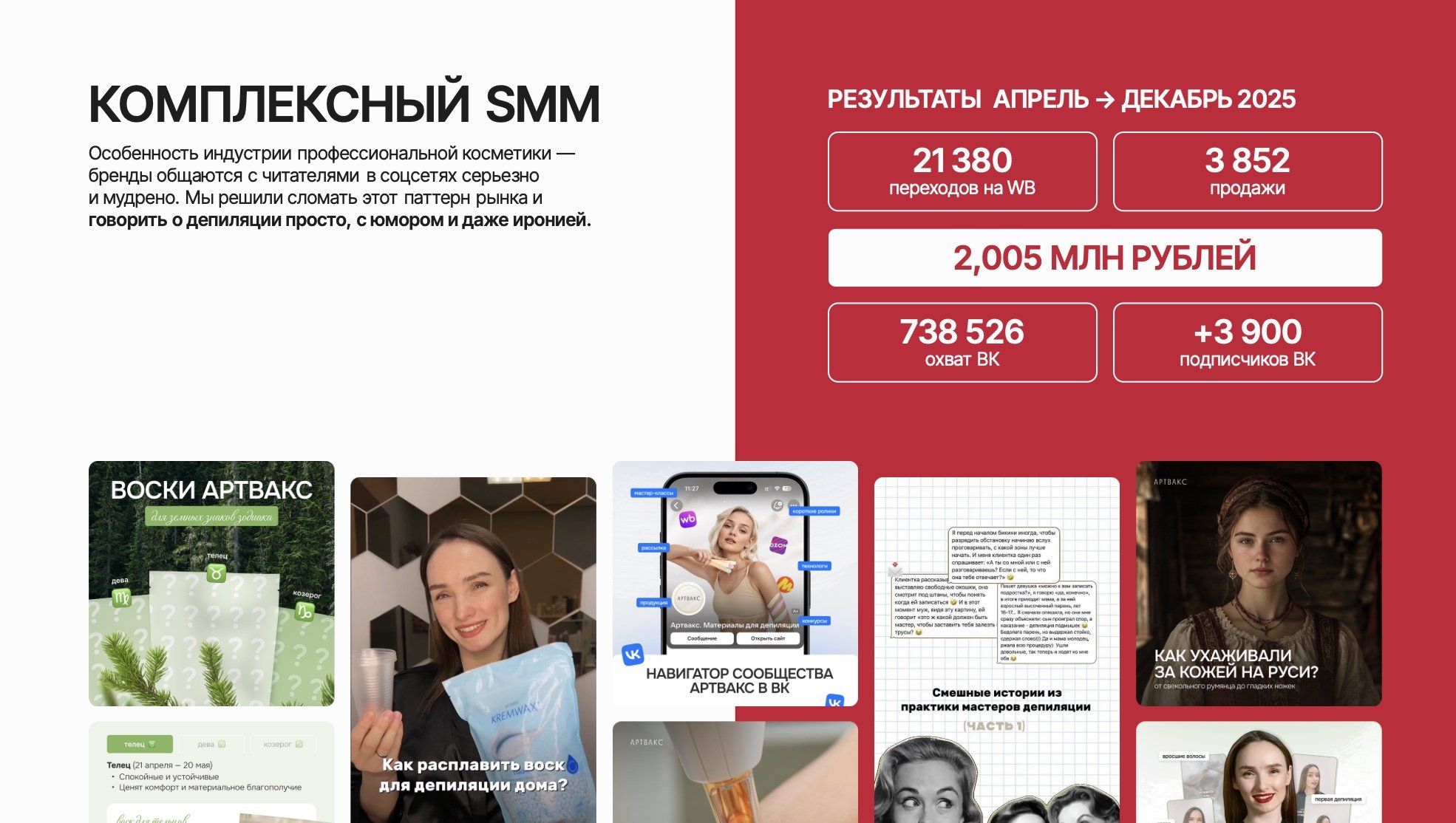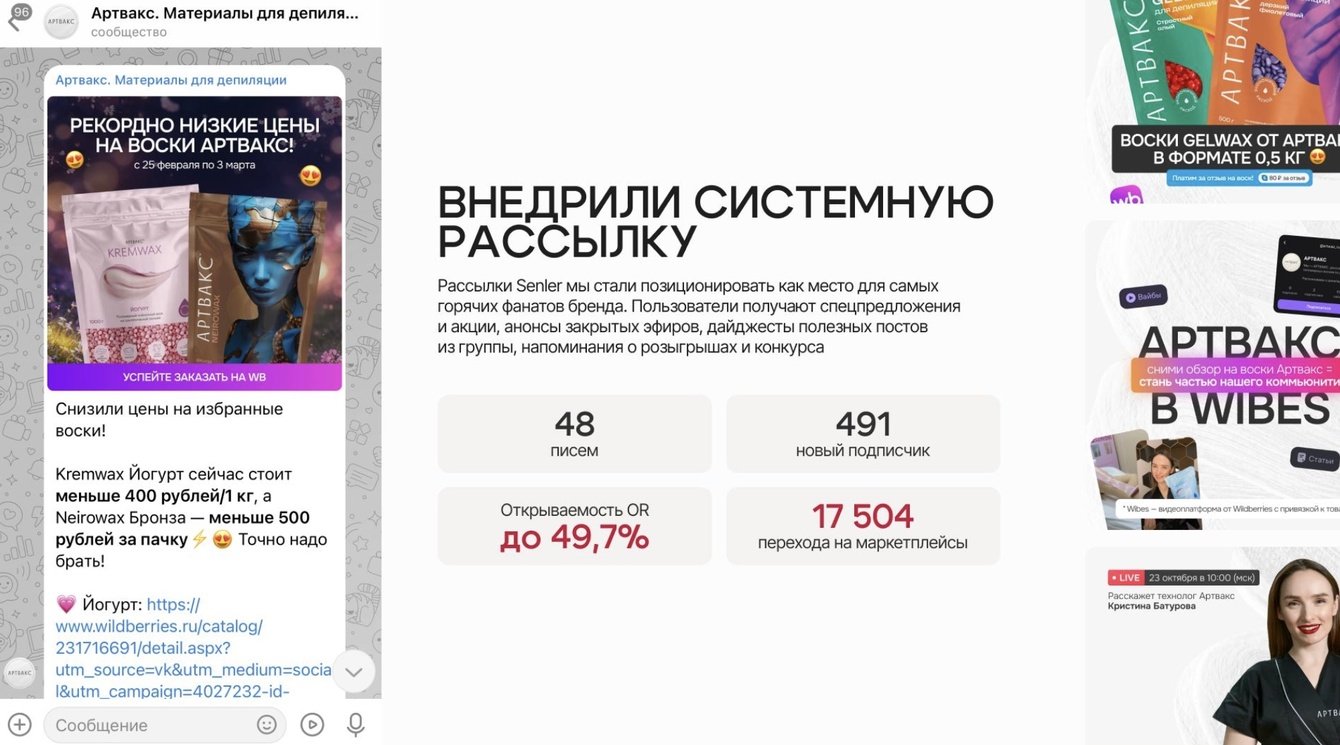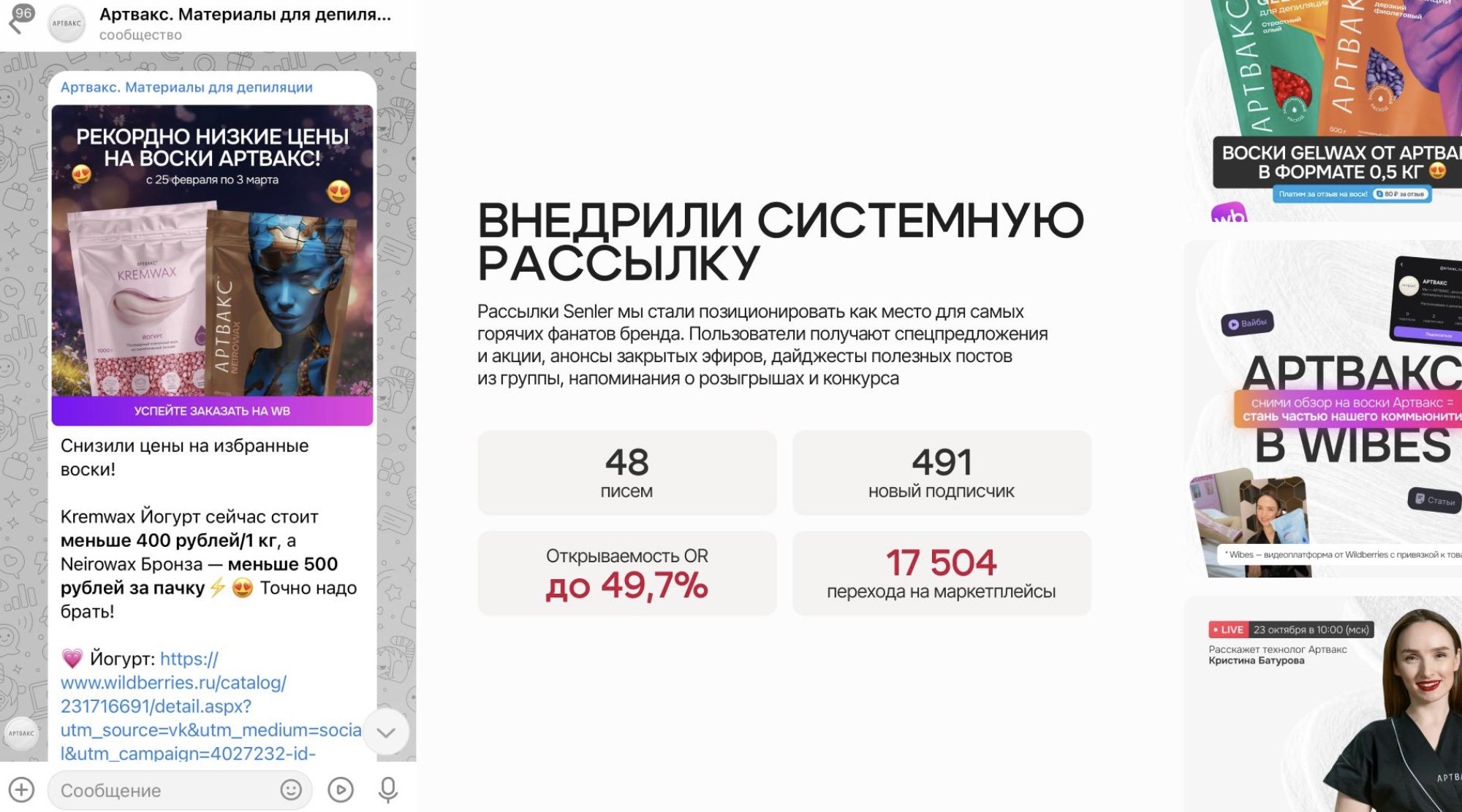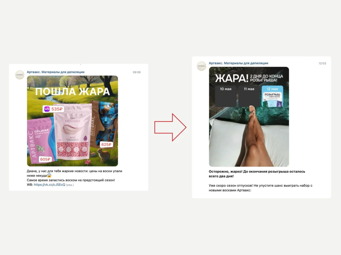 На момент марта 2025 у Артвакс был стандартный контент — посты о скидках, обзоры продуктов, прямые эфиры. Но живого общения с аудиторией было мало. При этом бренд имел сильное конкурентное преимущество — одну из самых низких цен на воск за 100 грамм на рынке.