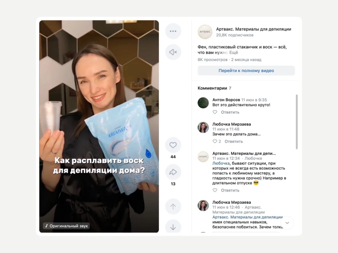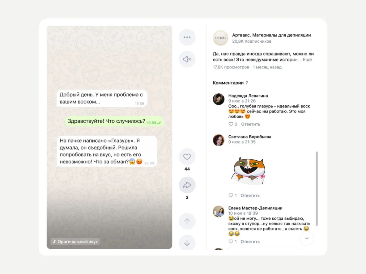Так, например, на маркетплейсах появился отзыв: «Ваш воск невкусный». Мы сделали из него короткий рилс с ироничной подачей. Итог — ролик «завирусился», набрал почти 18 тысяч просмотров (в 5 раз выше среднего охвата) и принёс бренду волну положительных реакций.