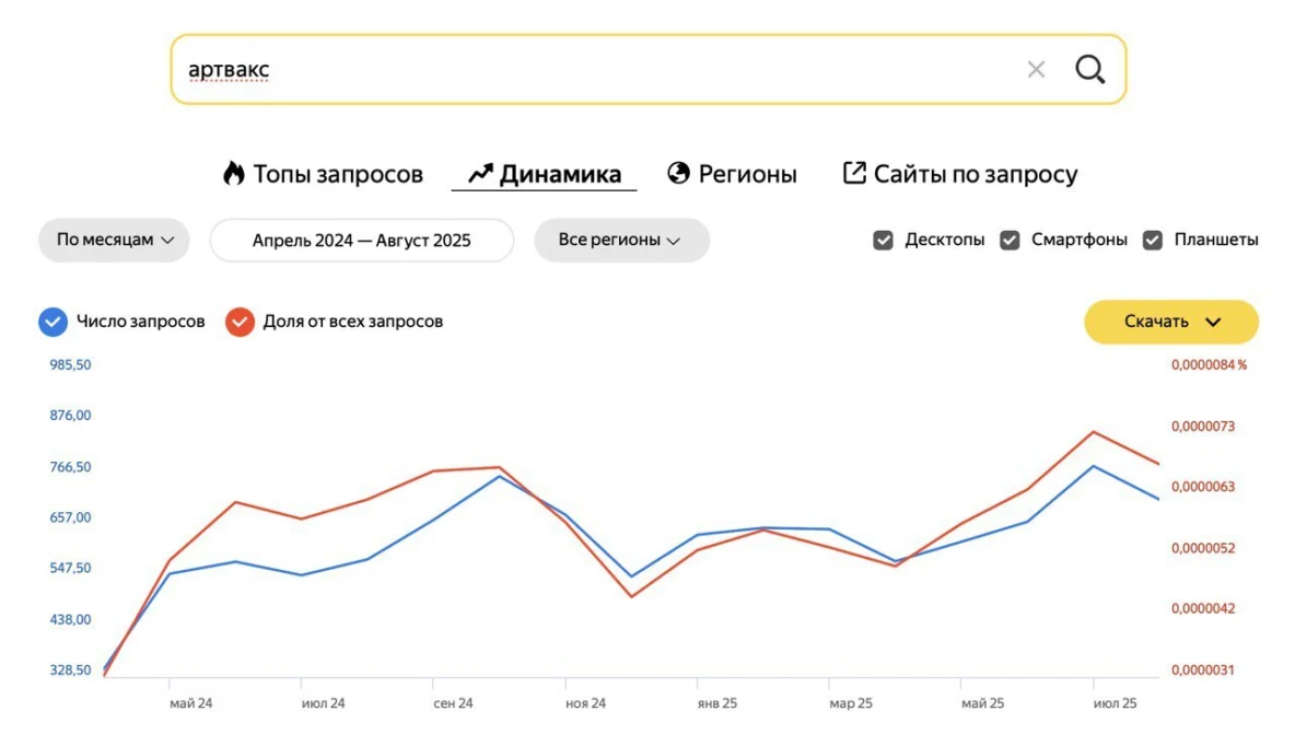 В июле 2025 случился рекорд по числу брендовых запросов в Яндекс Вордстате за всё время активности Артвакс в онлайн.