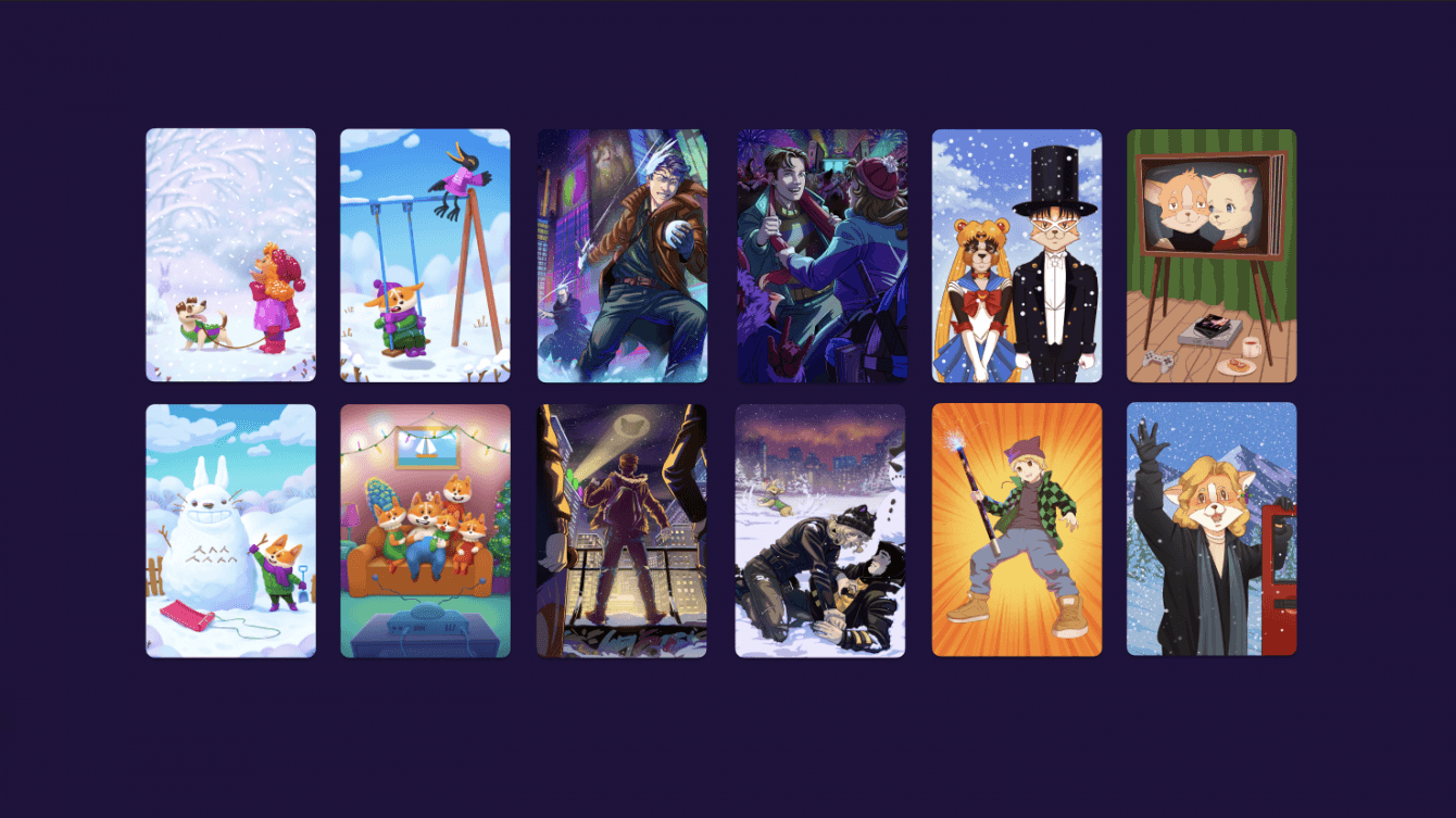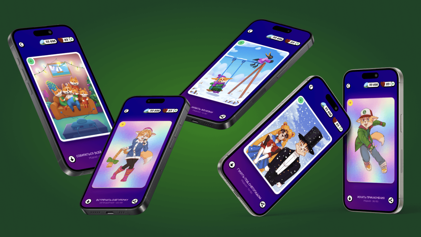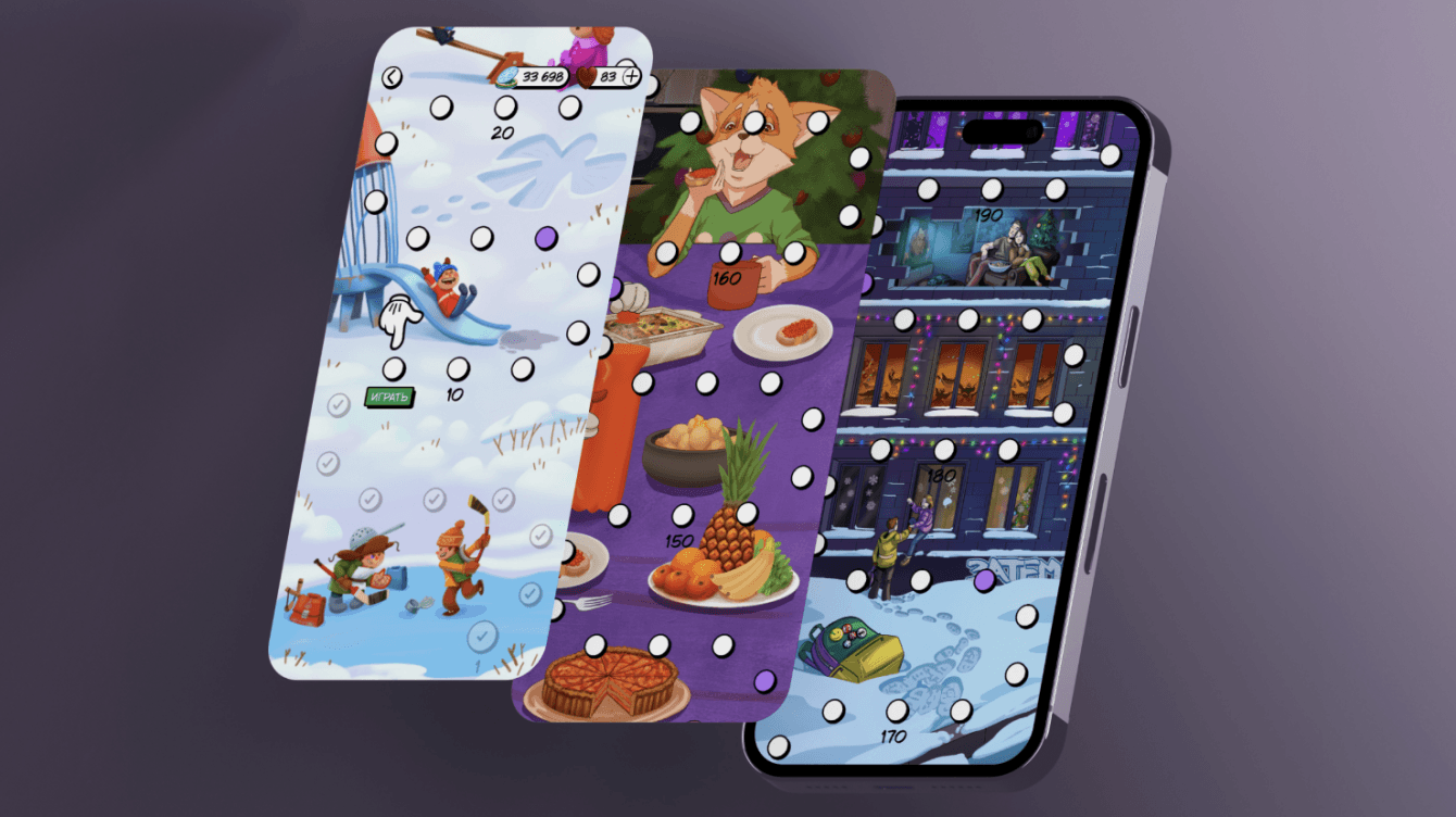 Чтобы реализовать свой замысел, мы в сотрудничестве с тремя иллюстраторами разработали карту уровней из 3 частей. Каждая часть выполнена в уникальном авторском стиле. Проходя уровни, игрок получает авторские коллекционные карточки с разными сюжетами. Сюжеты наполнены отсылками к массовой культуре и приятным воспоминаниям о каждом из жизненных этапов.