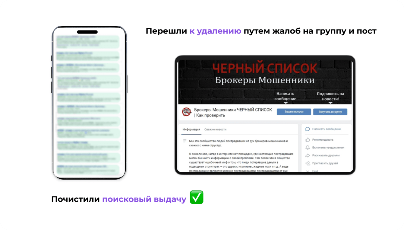 История могла бы закончиться на веселой ноте, но спустя два года мистер М снова обратился к нам с похожей проблемой. На этот раз его фото разместил некий паблик VK под названием «Черный список» с обвинениями в мошенничестве. Можно было бы насторожиться и предположить, что на мистера М объявили охоту, но прошлая проблема оказалась никак не связана с текущей. Мы не стали строить конспирологических теорий и перешли к удалению путем жалоб на группу и пост.