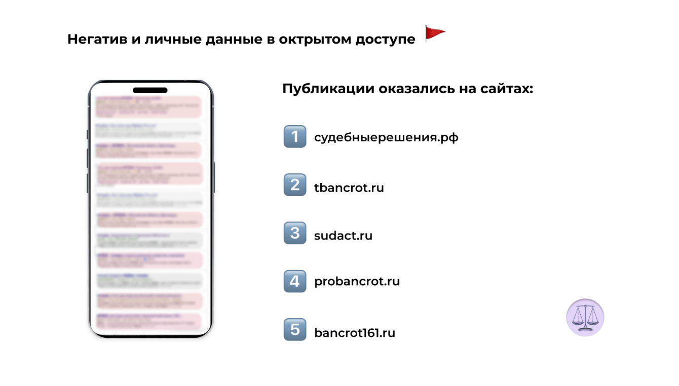 Клиенты гуглили ФИО, натыкались на информацию о том, что мистер М банкрот, и уходили к конкурентам. Помимо этого сайты раскрывали адрес проживания мистера М, СНИЛС, ИНН и номер телефона.