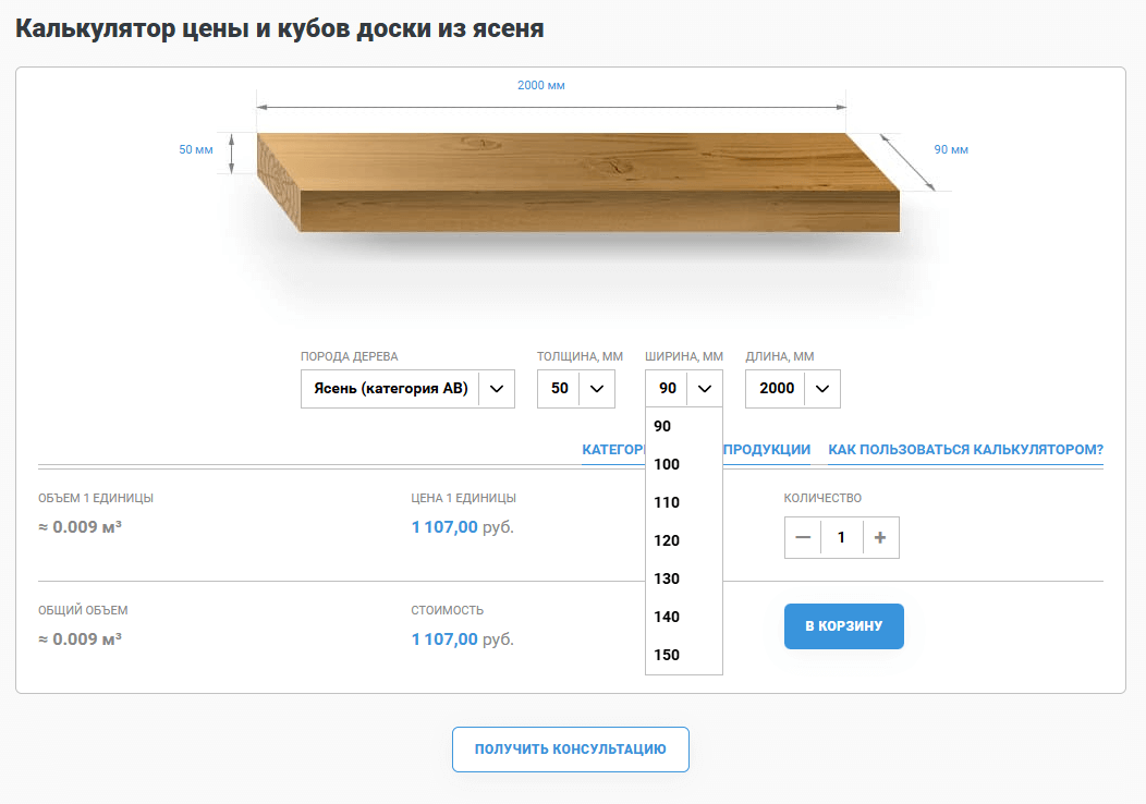 — Внедрили калькулятор стоимости с возможностью выбора ключевых параметров (порода дерева, толщина, объём и др.);