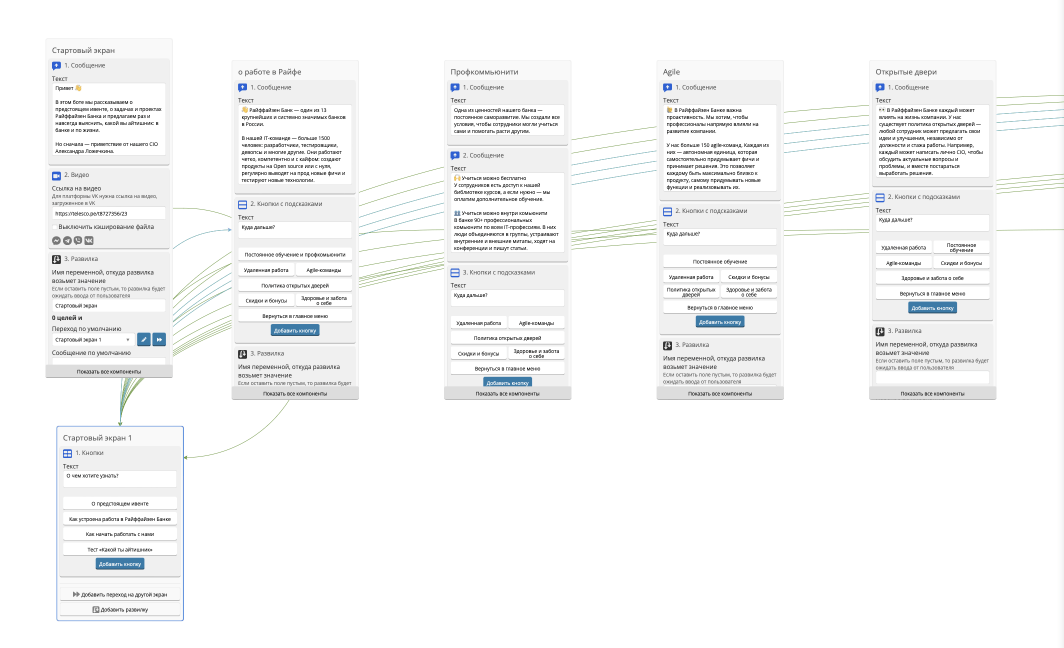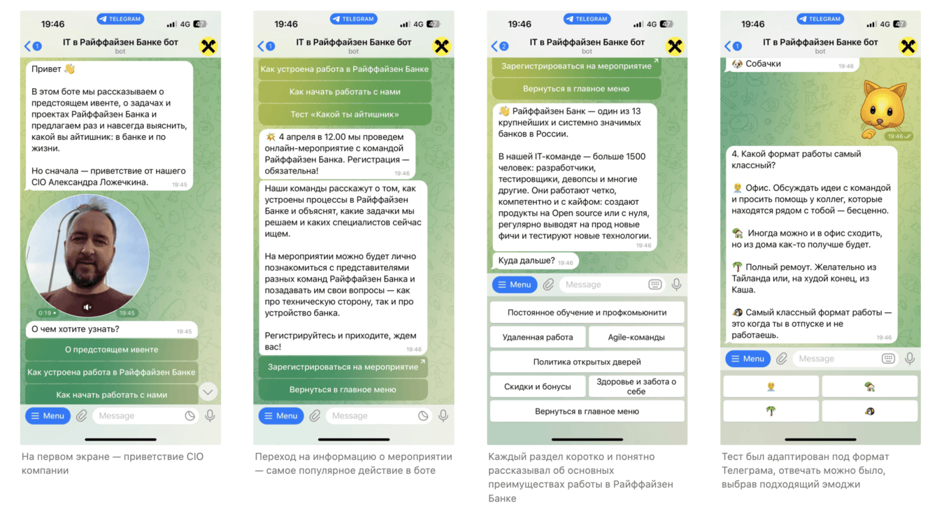 Мы собрали телеграм-бота с 4 разделами: о мероприятии, о банке, о работе в банке и тест.