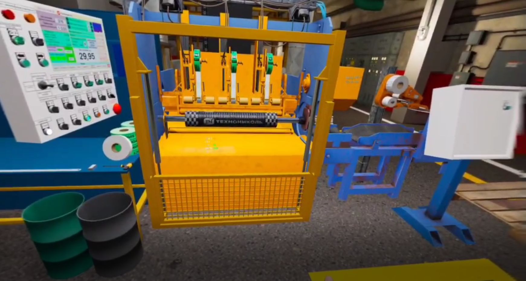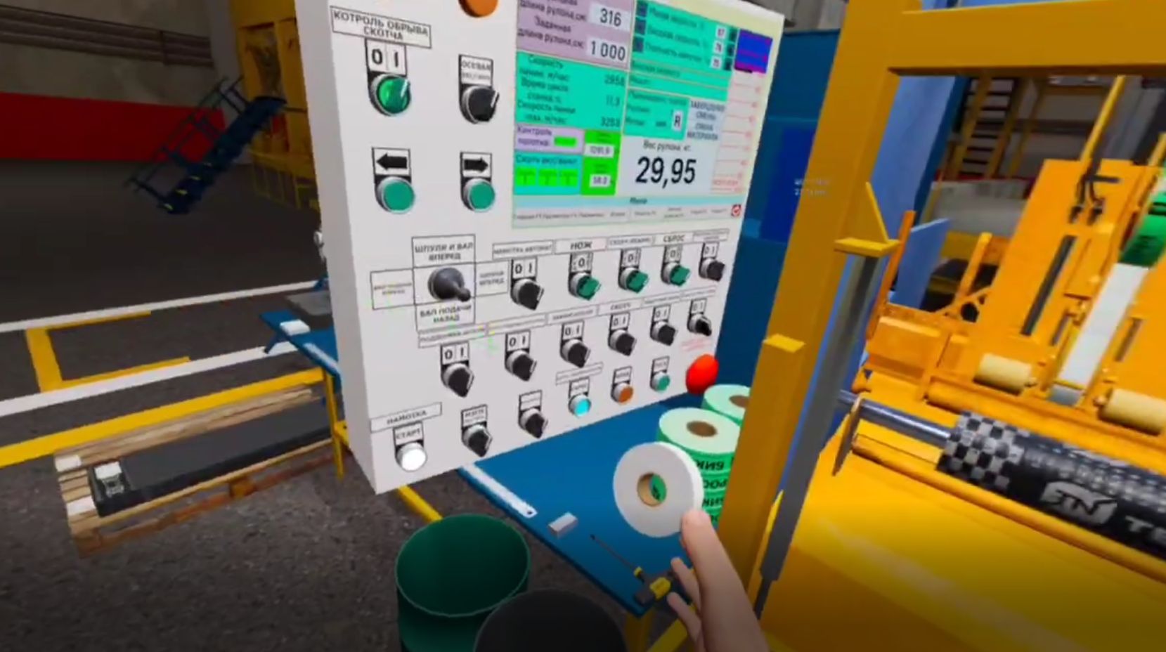 Пользователь взаимодействует с деталями руками или контроллерами: берет нож, настраивает натяжение, запускает станок.