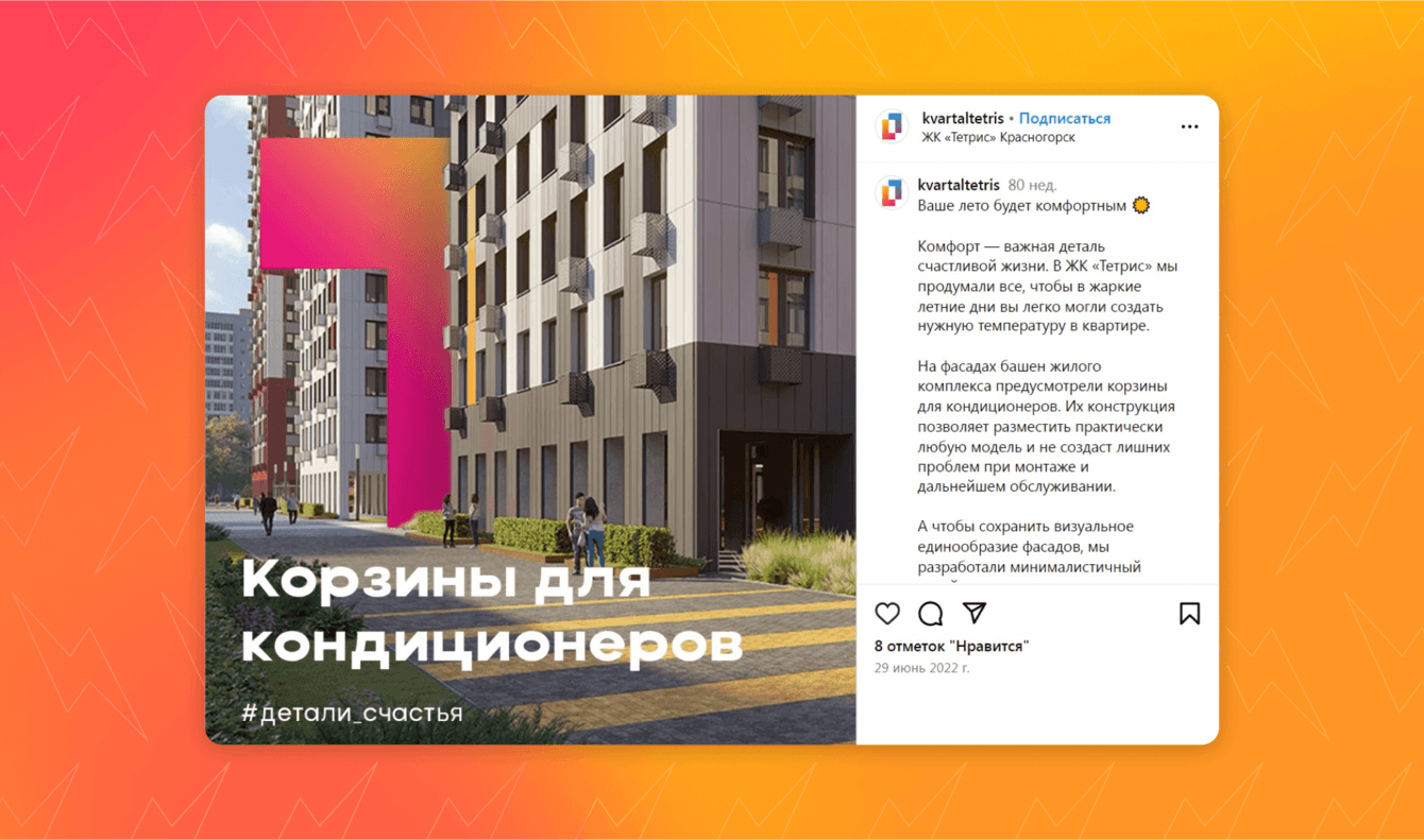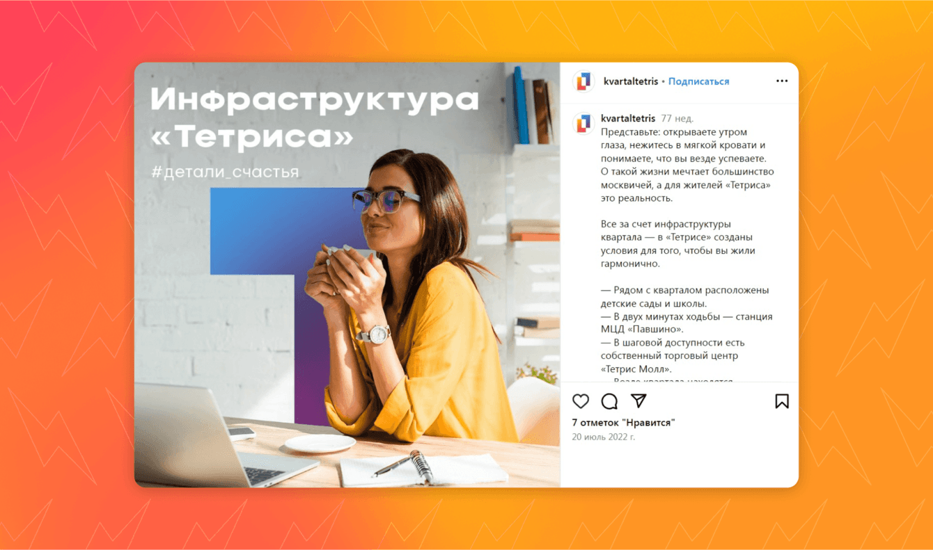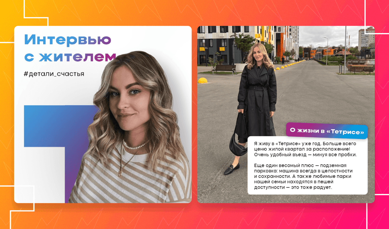 Мы регулярно отслеживали и реагировали на UGC-контент, ежемесячно добавляли его в коммуникацию. Создавали публикации с реальными людьми, которые выбрали «Тетрис» своей «деталью счастья». Рассказывали об их профессиях, семьях и увлечениях, знакомили будущих соседей онлайн. Такие публикации всегда попадали в топ.