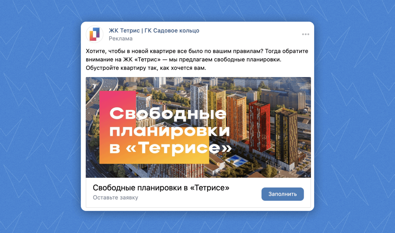 Изначально вся рекламная кампания проводилась в Instagram*, но вскоре после начала нашей работы рекламный кабинет был отключен в России. Тогда мы расширили целевую аудиторию с помощью таргетированной рекламы во ВКонтакте: настроили таргет на молодые семьи с детьми, которые интересуются покупкой жилья, ипотекой, маткапиталом и жилищными сертификатами.