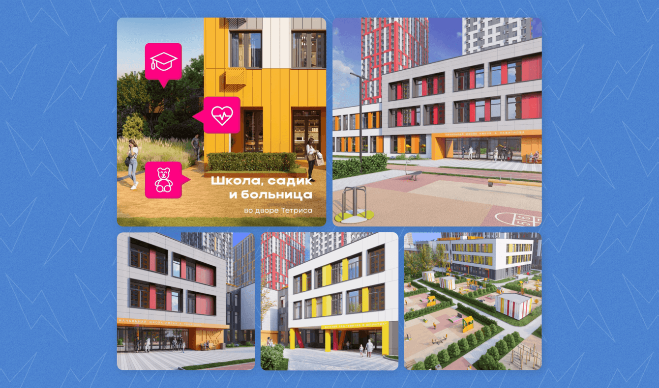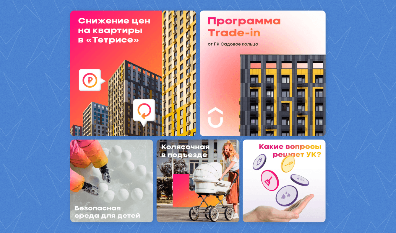 Чтобы привлечь внимание пользователей, использовали на фото яркие детали тетриса, градиентные фоны и заголовки. Для ответов на важные для аудитории вопросы создавали крупные акцентные заголовки. Единый узнаваемый дизайн помог девелоперу отстроиться от конкурентов.