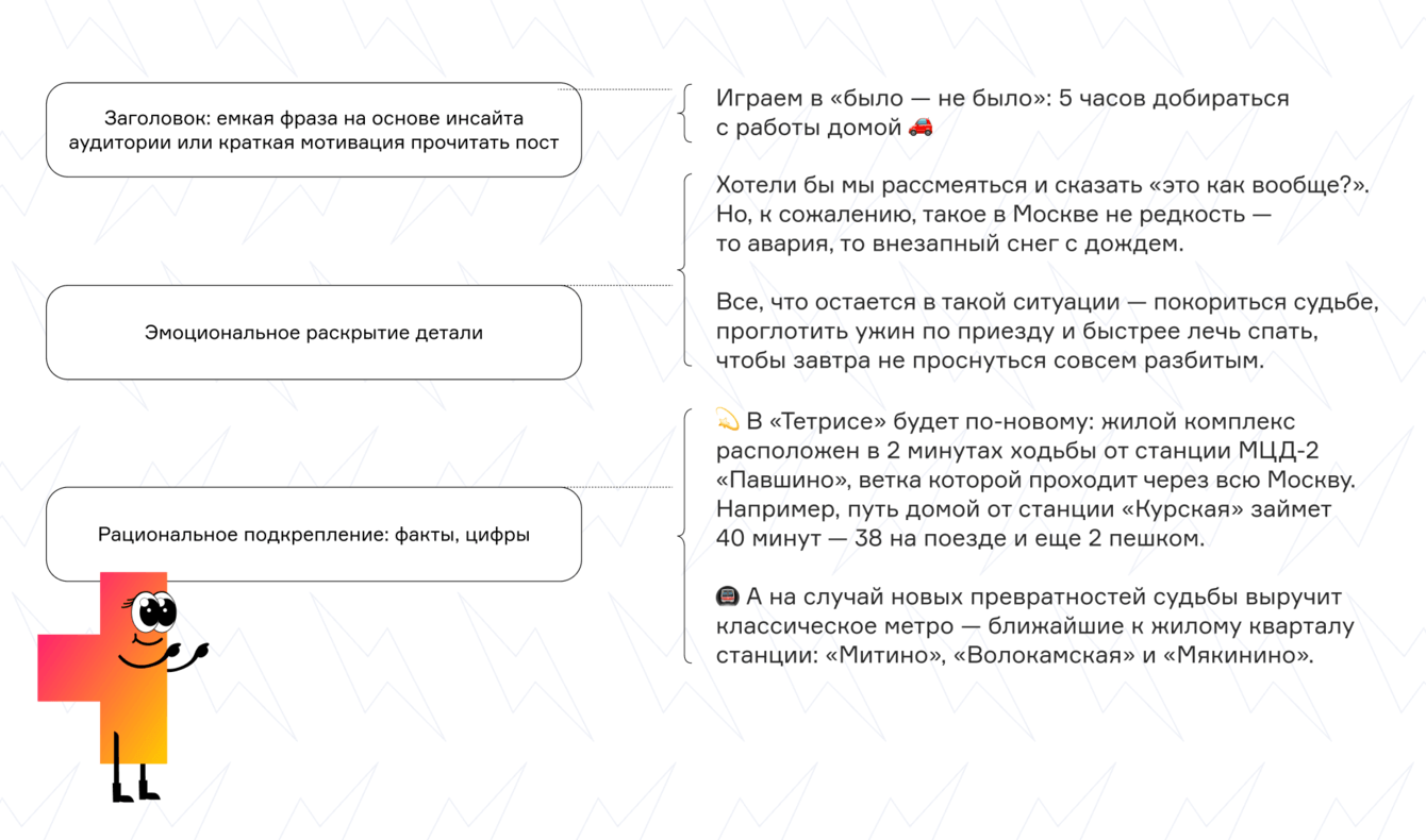 В контенте затрагивали тему перемен в жизни и радости, которые они за собой несут. Часть публикаций делали с подачи подписчиков, подробно отвечая на их запросы. Тексты строились по единой структуре. Начинали с эмоционального отклика — показывали, что переживания аудитории важны для девелопера. Затем эмоционально раскрывали «детали счастья» и подкрепляли это фактами и цифрами. Искренний tone of voice помог укрепить доверие к «Садовому кольцу».
