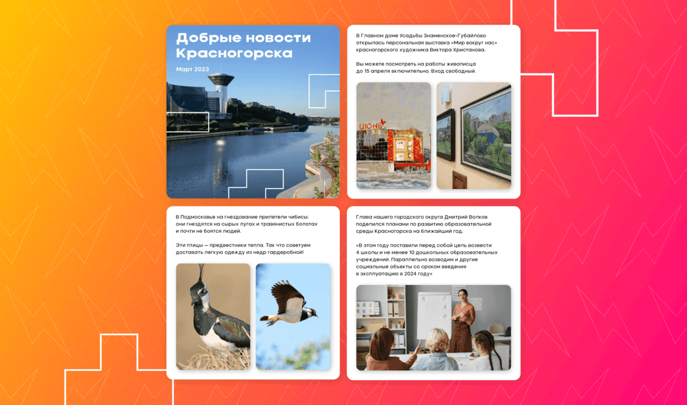 Основные темы публикаций — простые «детали счастья»: преимущества проекта, инфраструктура и локация, истории жителей и пользовательский контент. Каждый месяц выпускали новости на тему «Добрые новости Красногорска». Все это помогло сформировать позитивный образ семейного компаунда и локации, а также показать опыт жизни в нем.