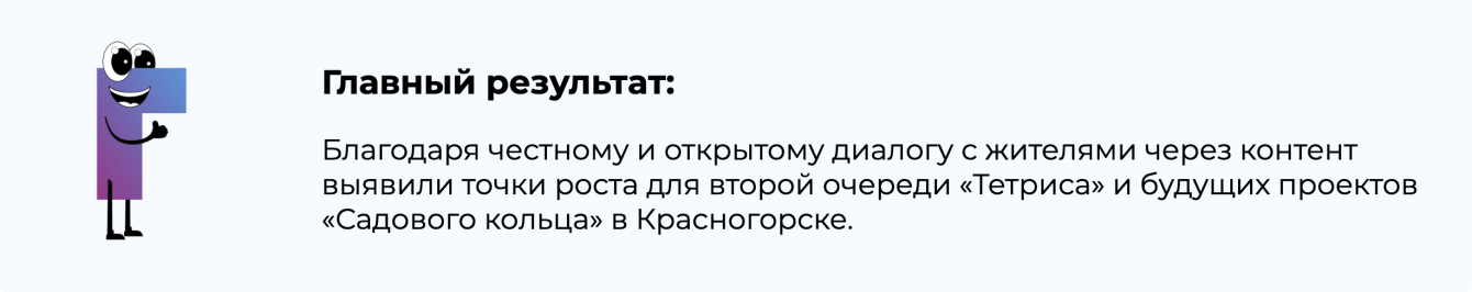 Благодаря открытым комментариям и быстрым ответам комьюнити, аудитория стала больше доверять девелоперу и делиться проблемами, которые есть в городе. Так мы выявили точки роста для второй очереди семейного компаунда и потенциальных проектов «Садового кольца» в Красногорске. Негатив отрабатывали так, чтобы поменять уже сформированное мнение и привлечь пользователей к покупке квартиры.