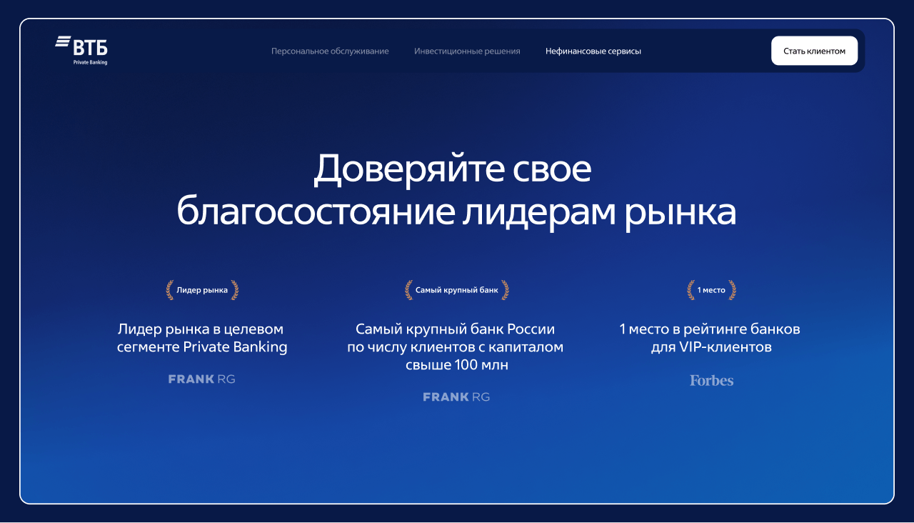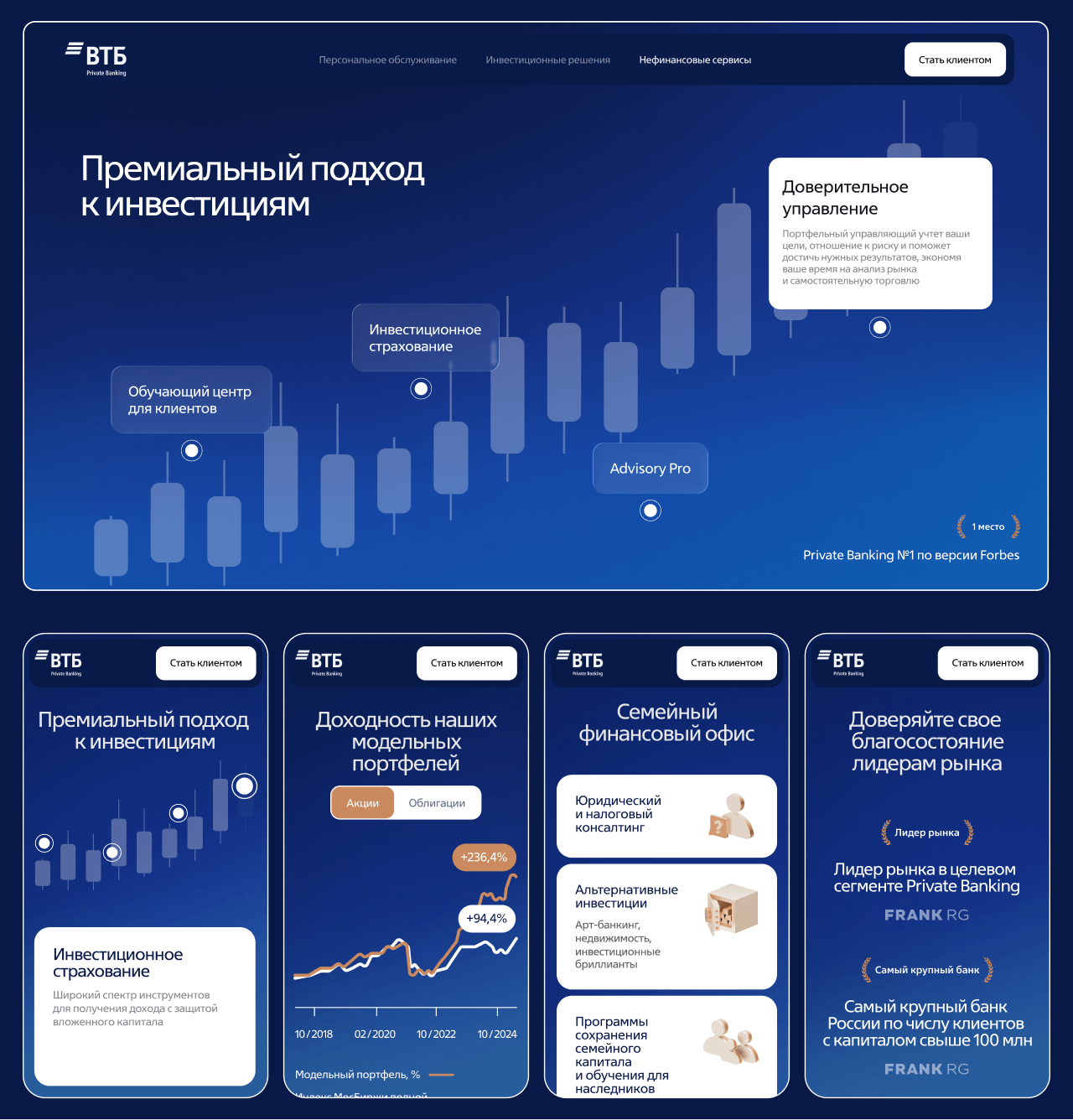 Для аудитории Private Banking важнее не детали продукта, а ощущение личной значимости и уверенности. Мы вынесли на первый план эмоцию и восприятие: пользователь должен почувствовать, что сервис уже адаптирован под него — без необходимости разбираться в сложных условиях.