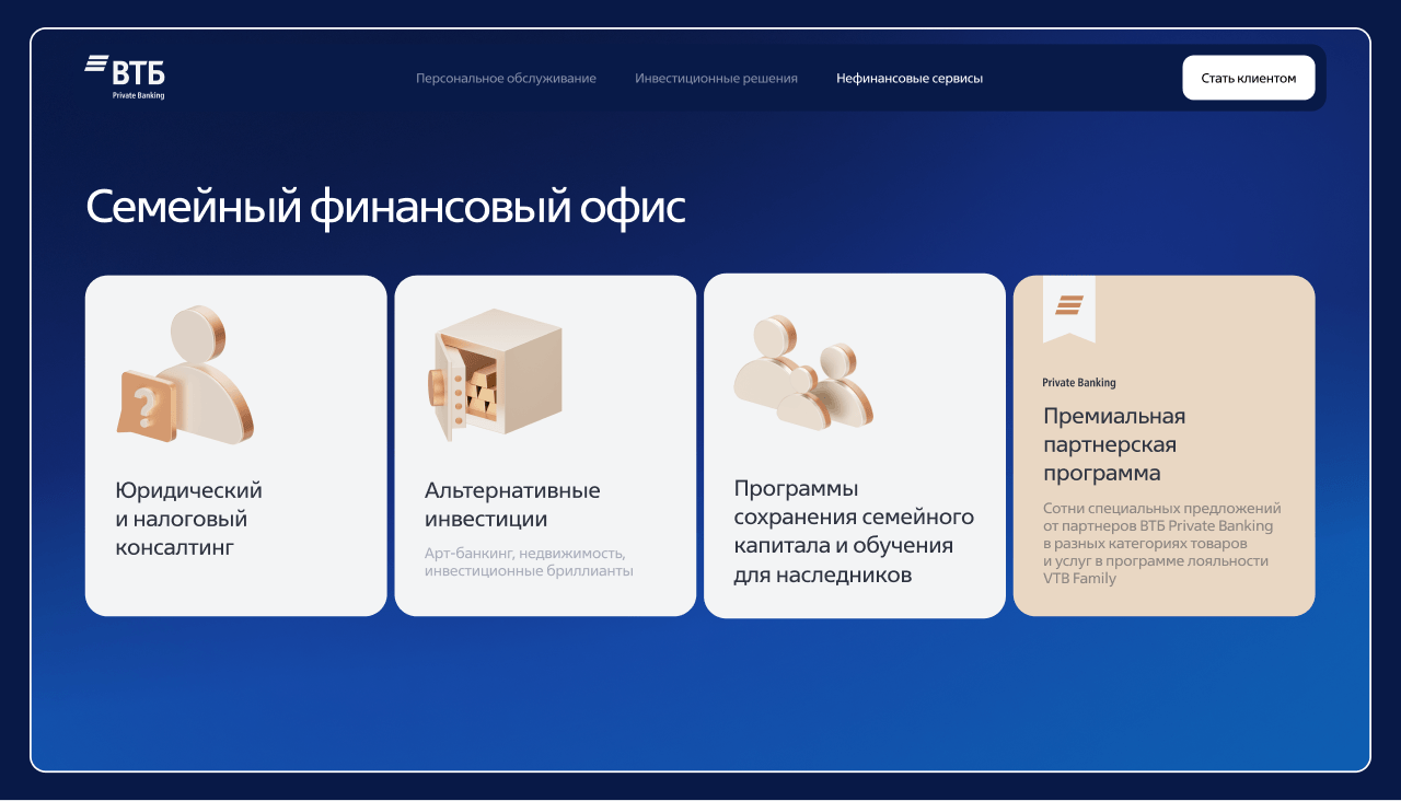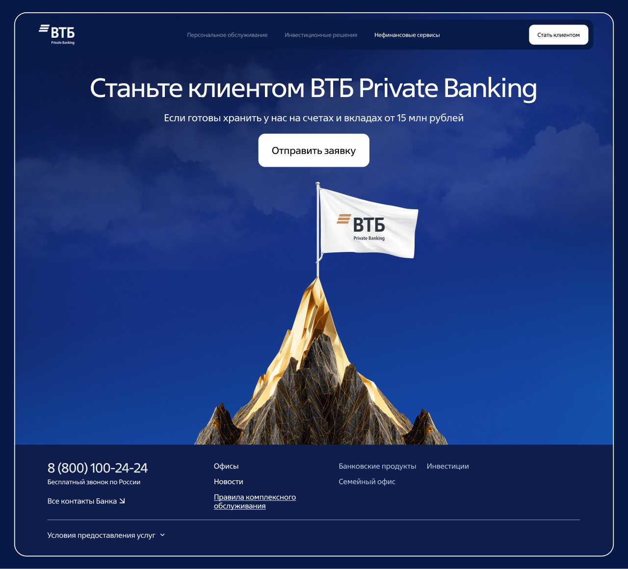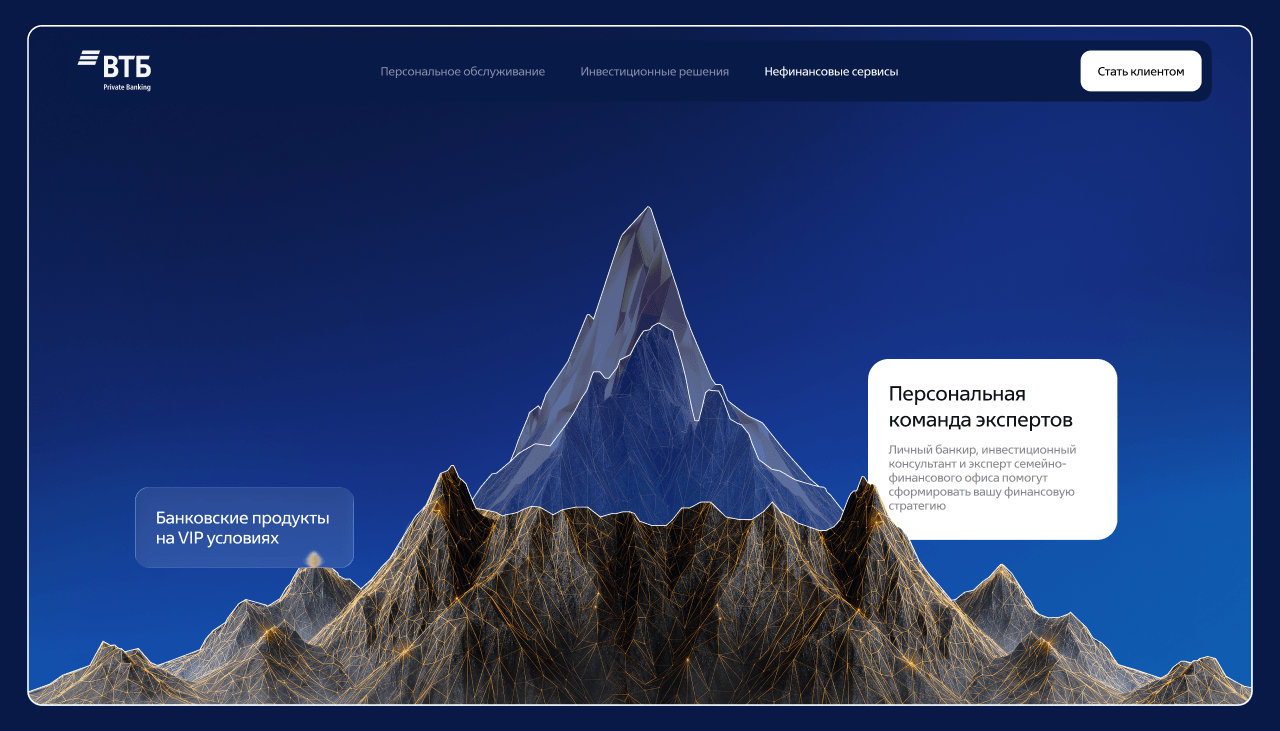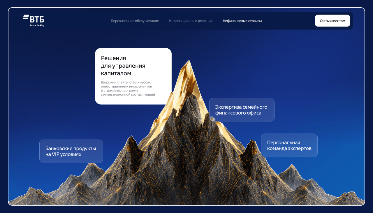 Ключевой метафорой стала гора — символ достижения, устойчивости и высшего уровня сервиса. На её основе мы выстроили сценарий лендинга как последовательное движение вверх: от знакомства с философией Private Banking к конкретным возможностям для клиента и его семьи. Такой подход помогает постепенно раскрывать ценность сервиса без перегрузки и делает сложный продукт интуитивно понятным.