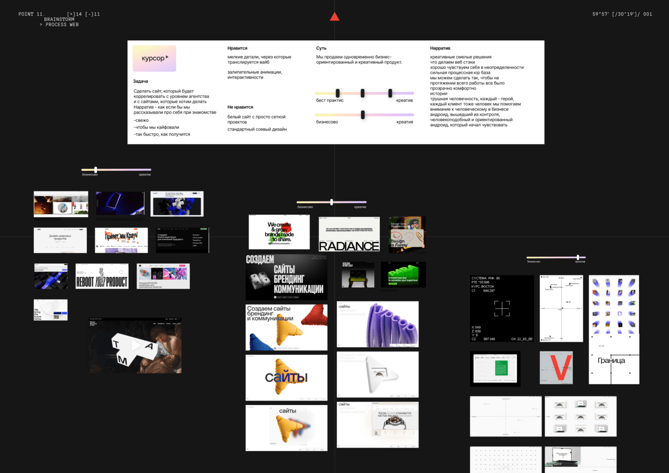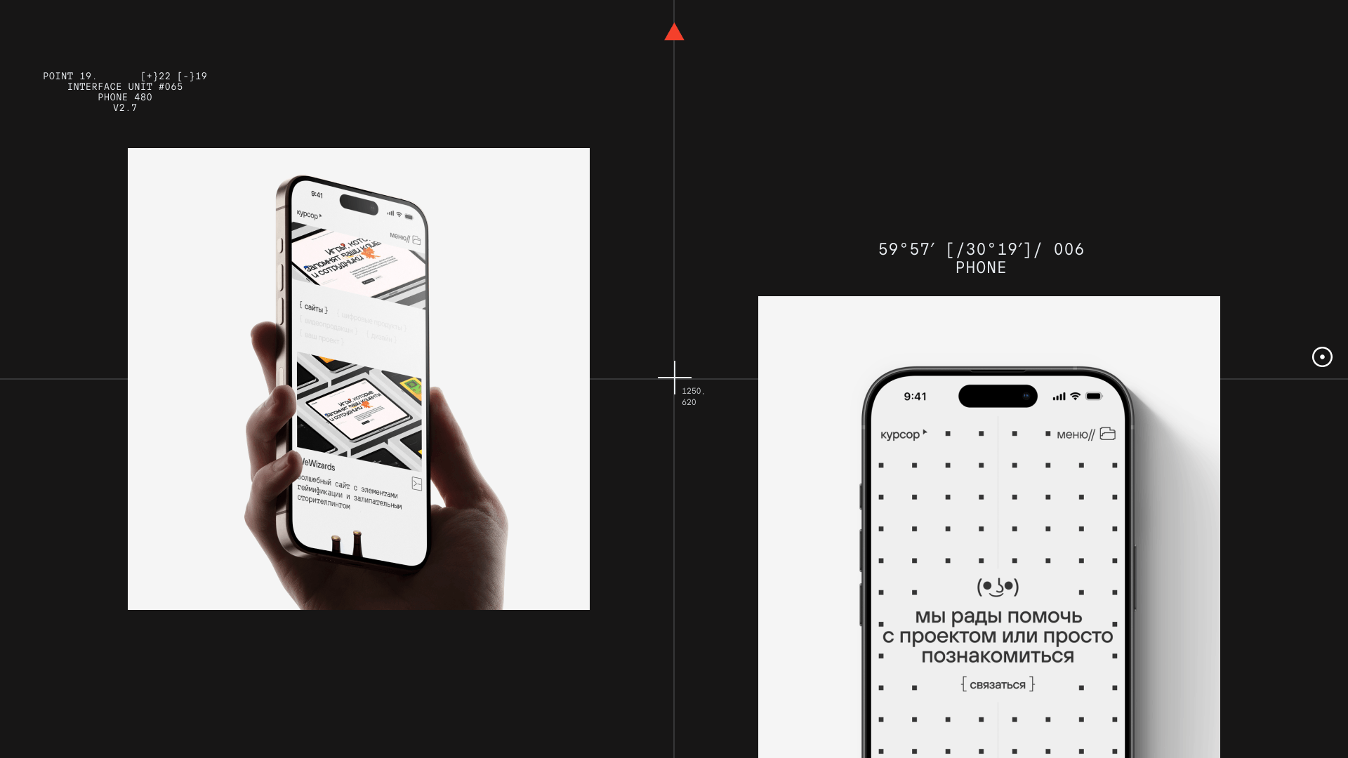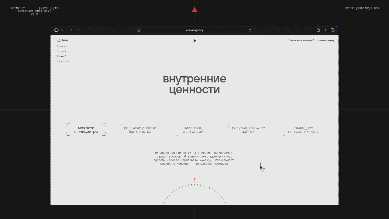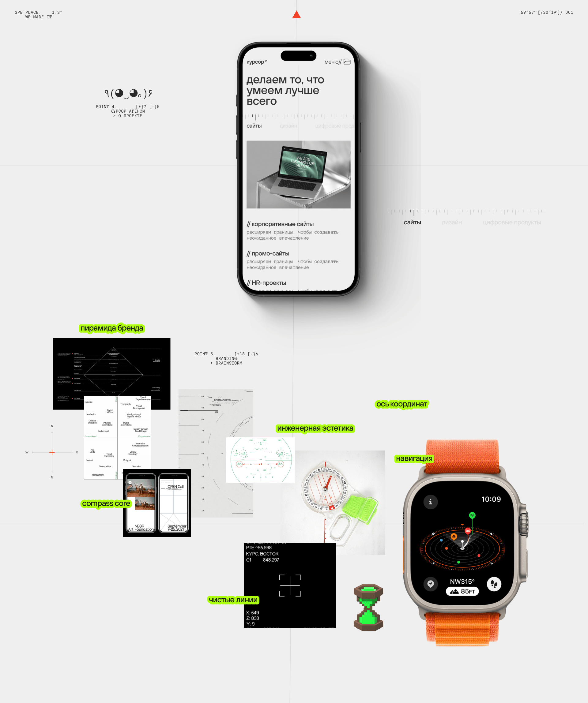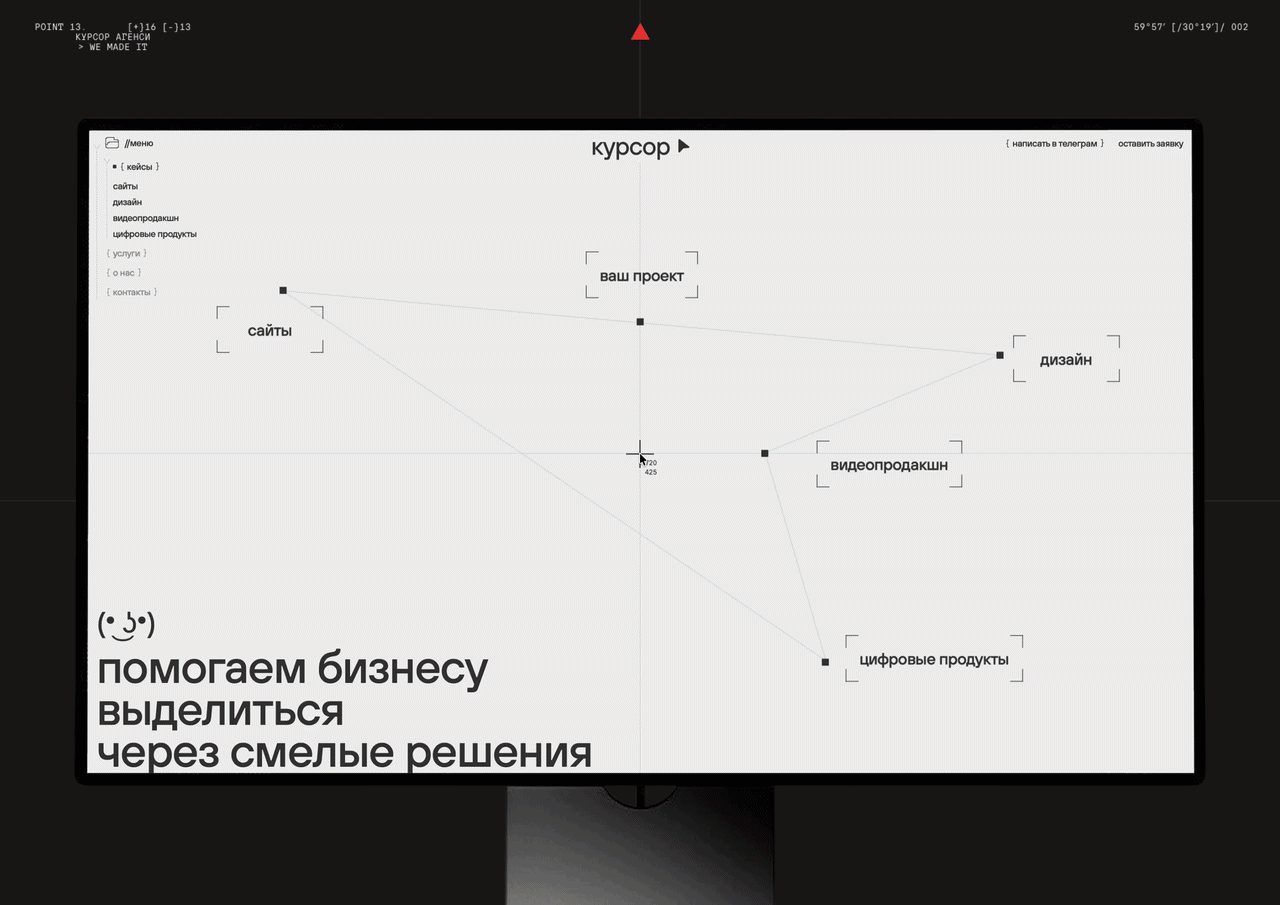 На этапе референсов Ксюша пришла к метафоре системы координат и компаса. Курсор – как навигатор, ориентир и помощник.