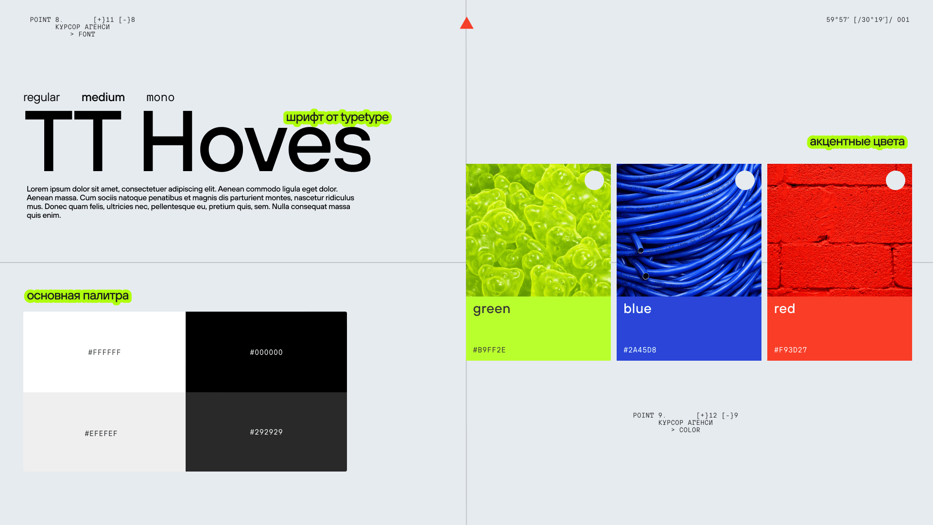 В типографике выбрали шрифт TT Hoves Pro. Цветовую палитру сделали максимально нейтральной, сделав акцент только на кейсах.
