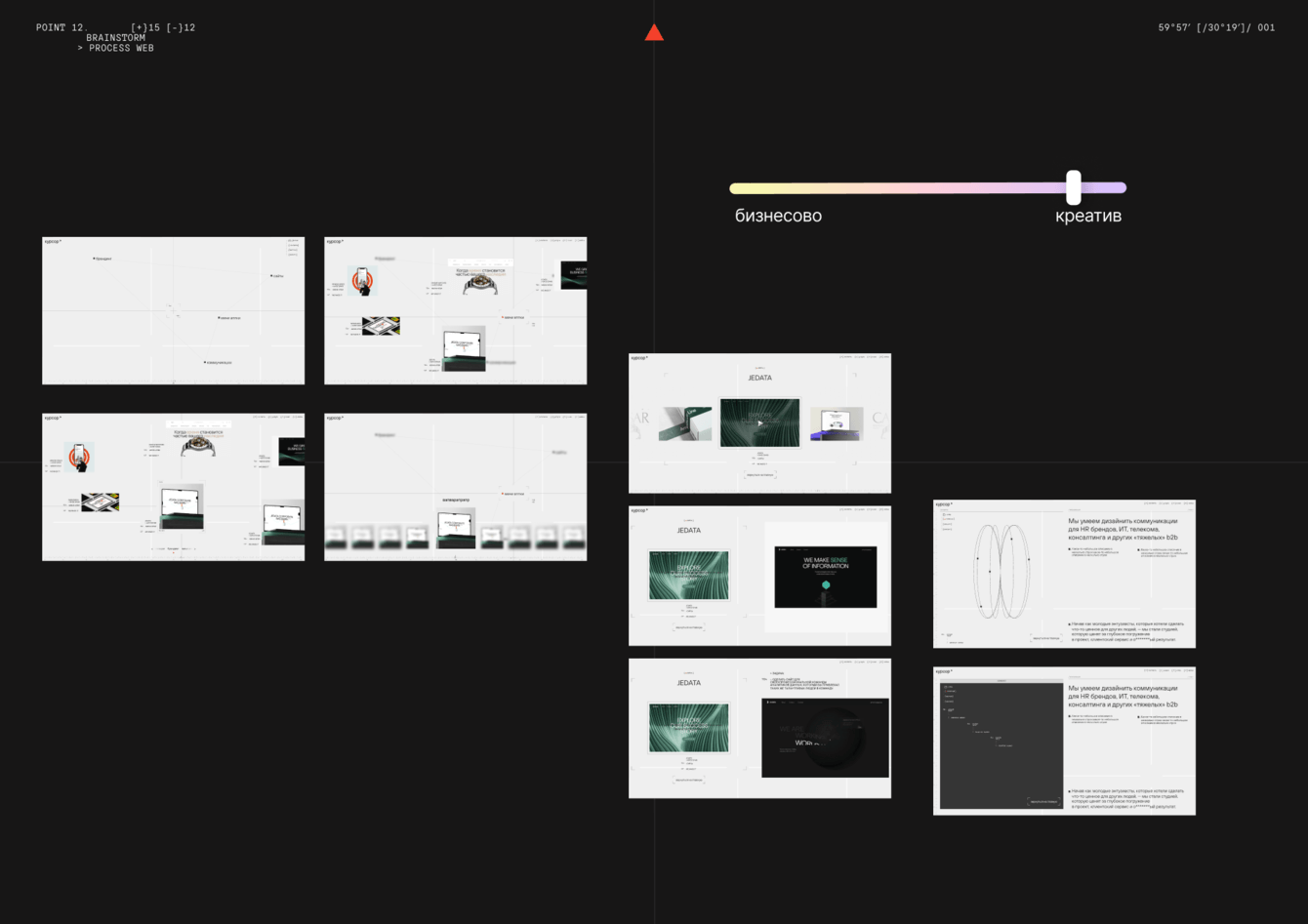 Когда структура была готова, дизайнеры начали искать визуальное направление. При разработке концепций экранов мы всегда используем шкалу характера бренда, и собственный ребрендинг не стал исключением. За день дизайнеры проработали два полюса: от консервативного бизнес-подхода до максимально креативного.