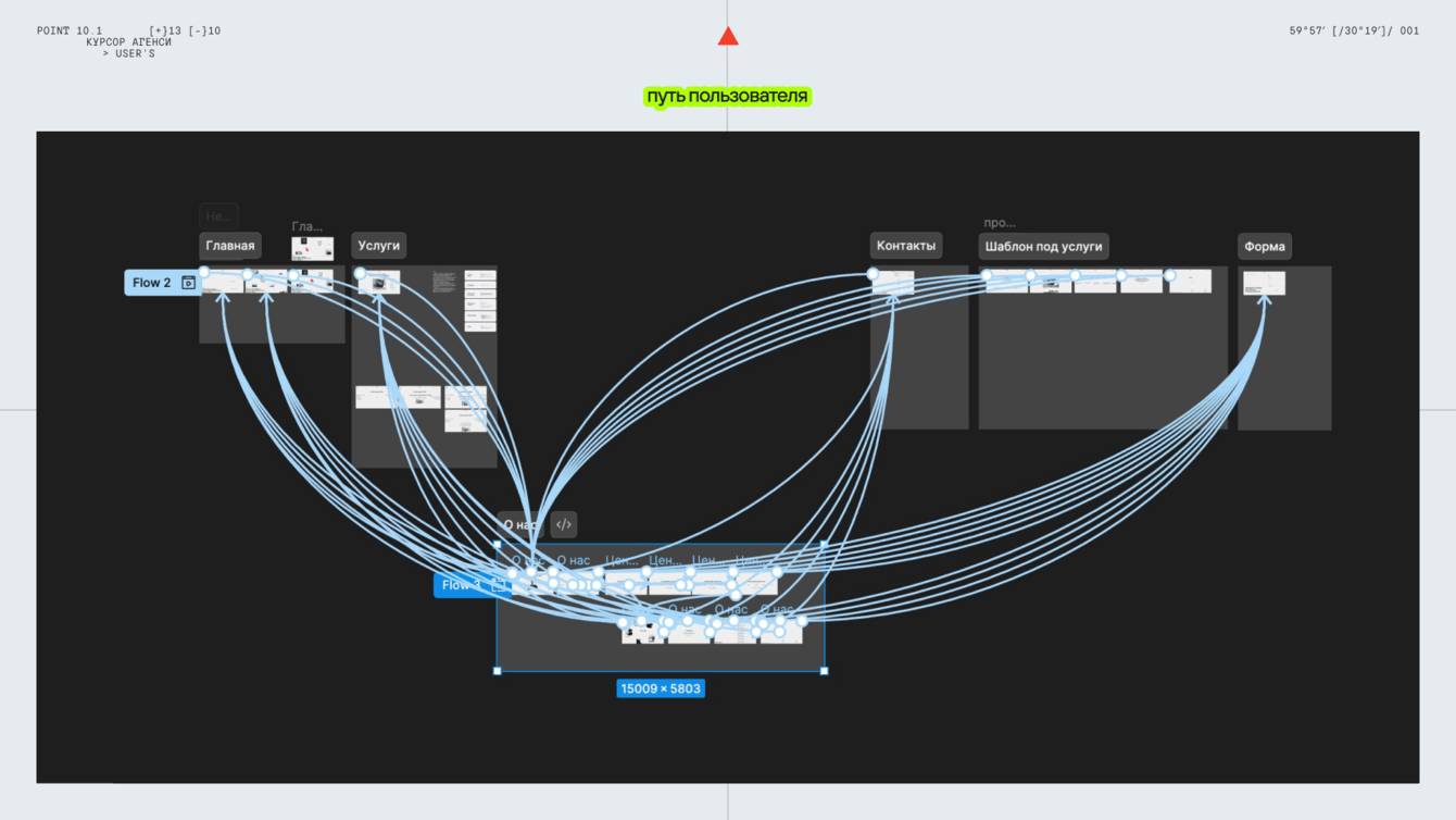 Раз мы нарушили привычные паттерны, то и путь пользователя решили сделать нестандартным: скролл главной, затем кейсы по специализации, а меню — точка входа на страницы «Услуги» и «О нас».