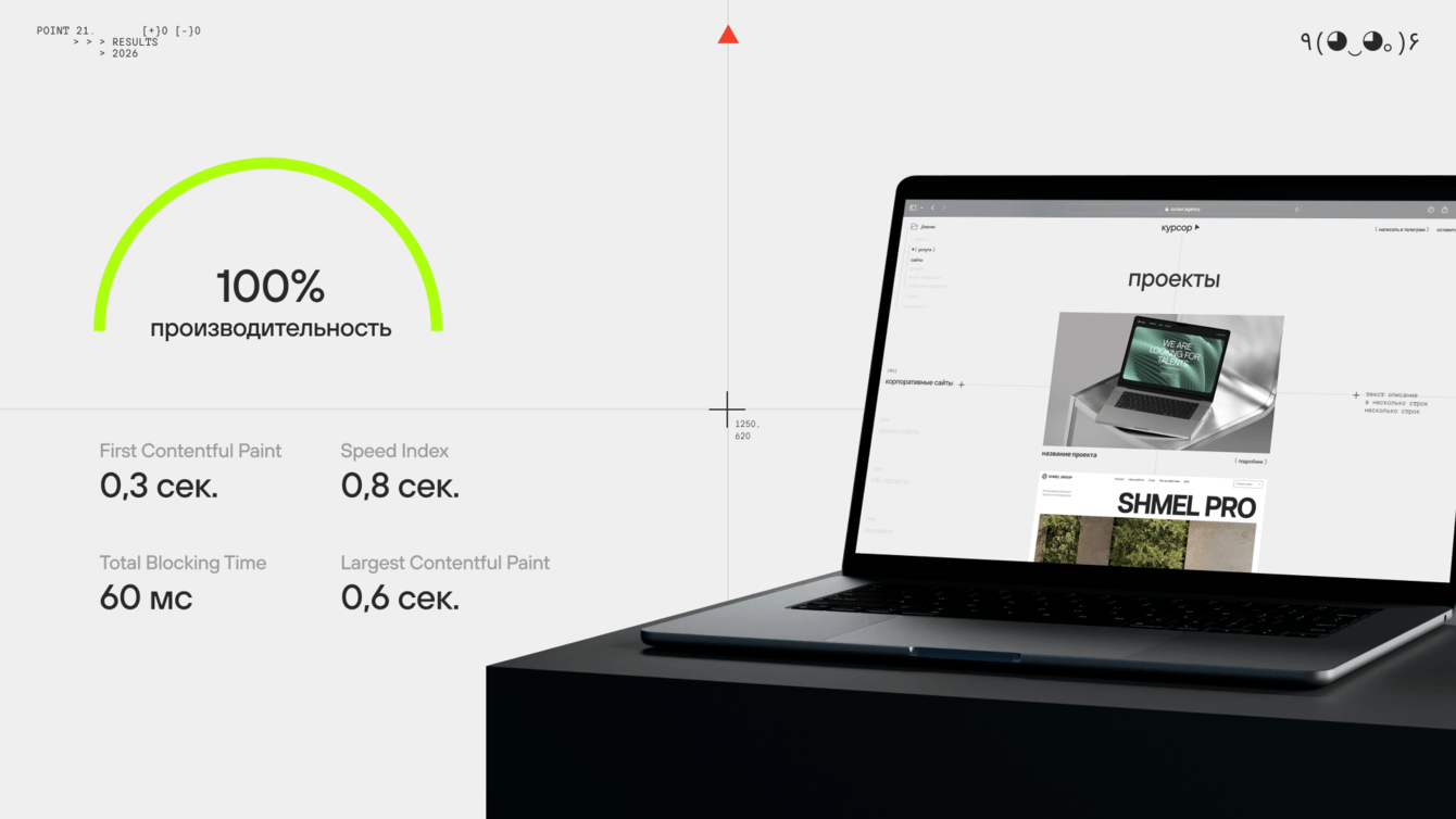 Нестандартная верстка не помешала и техническому качеству: сайт стабильно показывает 100/100 в Google PageSpeed Insights.