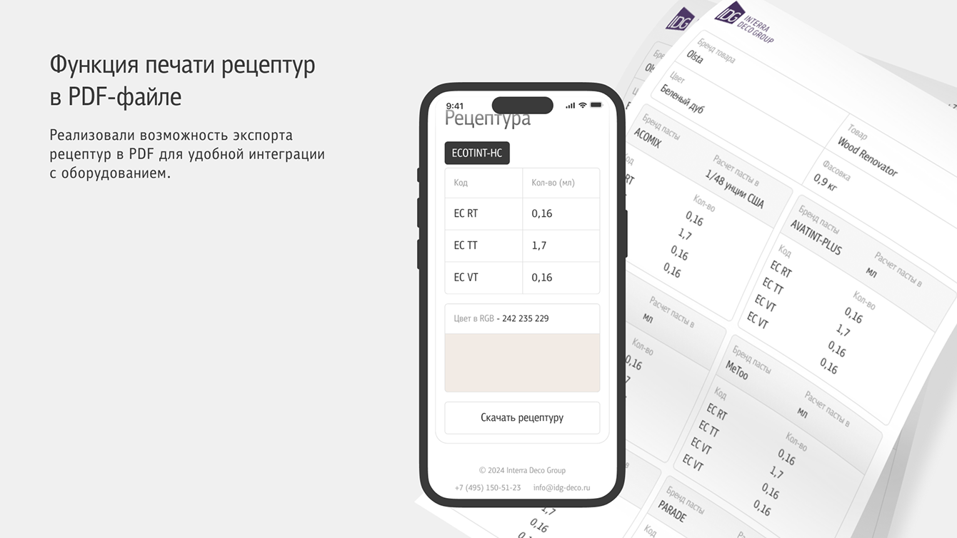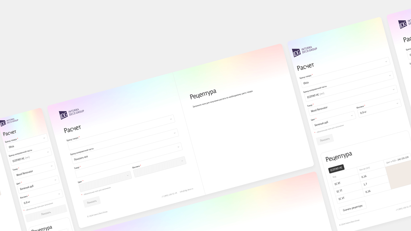 Для холдинга Interra Deco Group мы разработали внутренний сервис колеровки Color-Composer, который заменил громоздкую Google-таблицу, ранее использовавшуюся дистрибьюторами и дилерами. Ранее пользователи сталкивались с необходимостью многократного поиска рецептур через различные вкладки Google-таблицы. Наше решение не только упростило поиск рецептур, но и обеспечило безопасность данных.