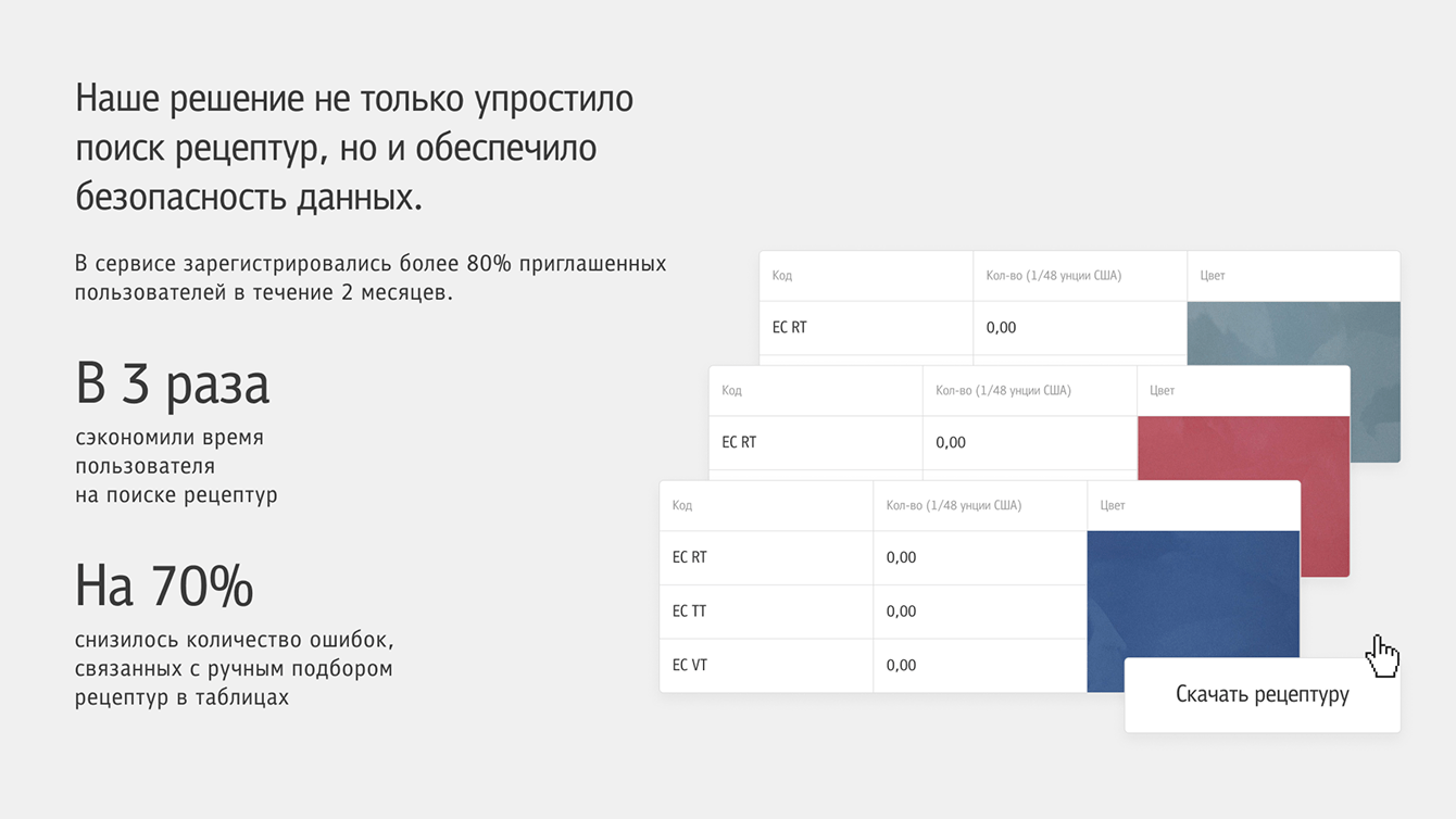 Благодаря удобному интерфейсу сэкономили время сотрудников в 3 раза через автоматизацию подбора рецептур — сервис автоматически подбирает рецептуру для колеровочной машины на основе выбранного товара (краски, штукатурки или грунта) и его цвета.