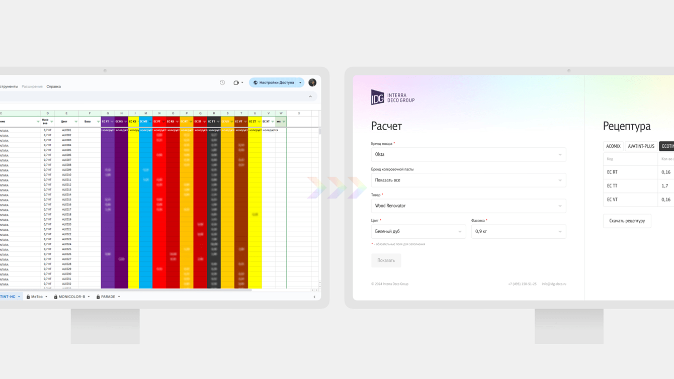 Компания Interra Deco Group управляет обширной базой данных, содержащей более 45 000 рецептур для колеровочных паст 5-ти брендов, планируется добавление еще нескольких брендов колеровочных паст. Использование Google-таблиц создавало множество проблем, таких как: