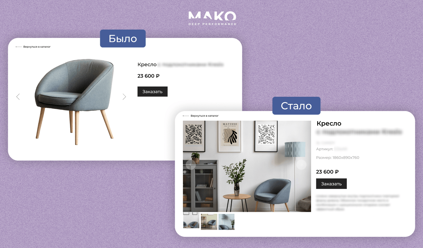 В интернет-магазине мебели все позиции были выгружены одним списком, в карточках ― по одному фото. Конверсия из перехода в покупку оставляла желать лучшего ― 0,36%. Добавили cross- и upsale-блоки, а в карточку товара ― размеры, описание, изображения в интерьере и сценарии использования (кому подойдет диван или кресло, в какой стиль впишется).