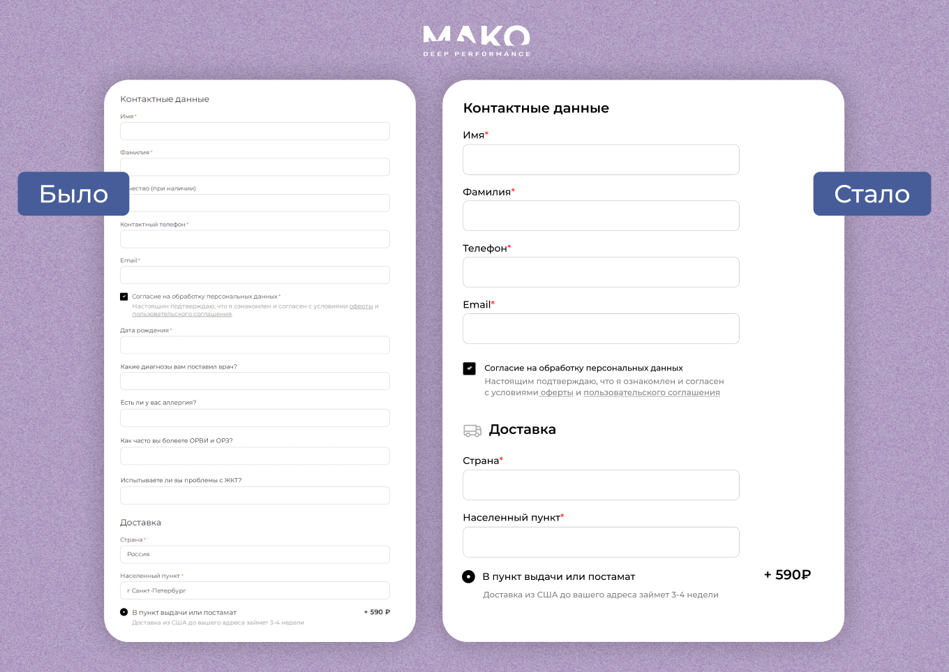 Яркий пример из нашей практики ― в интернет-магазине БАДов форма заказа содержала более 10 полей (!), причем с мелким серым шрифтом. Чтобы заказать товары, нужно было подробно рассказать о своем здоровье: диагнозах, наличии аллергии и проблем с ЖКТ, частоте простудных заболеваний. Таким образом магазин собирал данные об аудитории, но это раздражало клиентов, и они бросали оформление заявки.