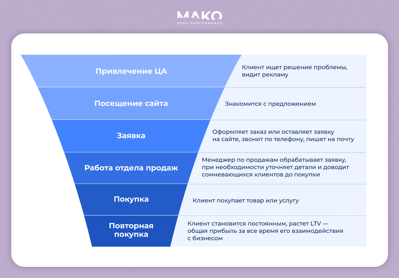 Воронка продаж показывает путь клиента от первого касания с товаром или услугой до покупки или повторных покупок.