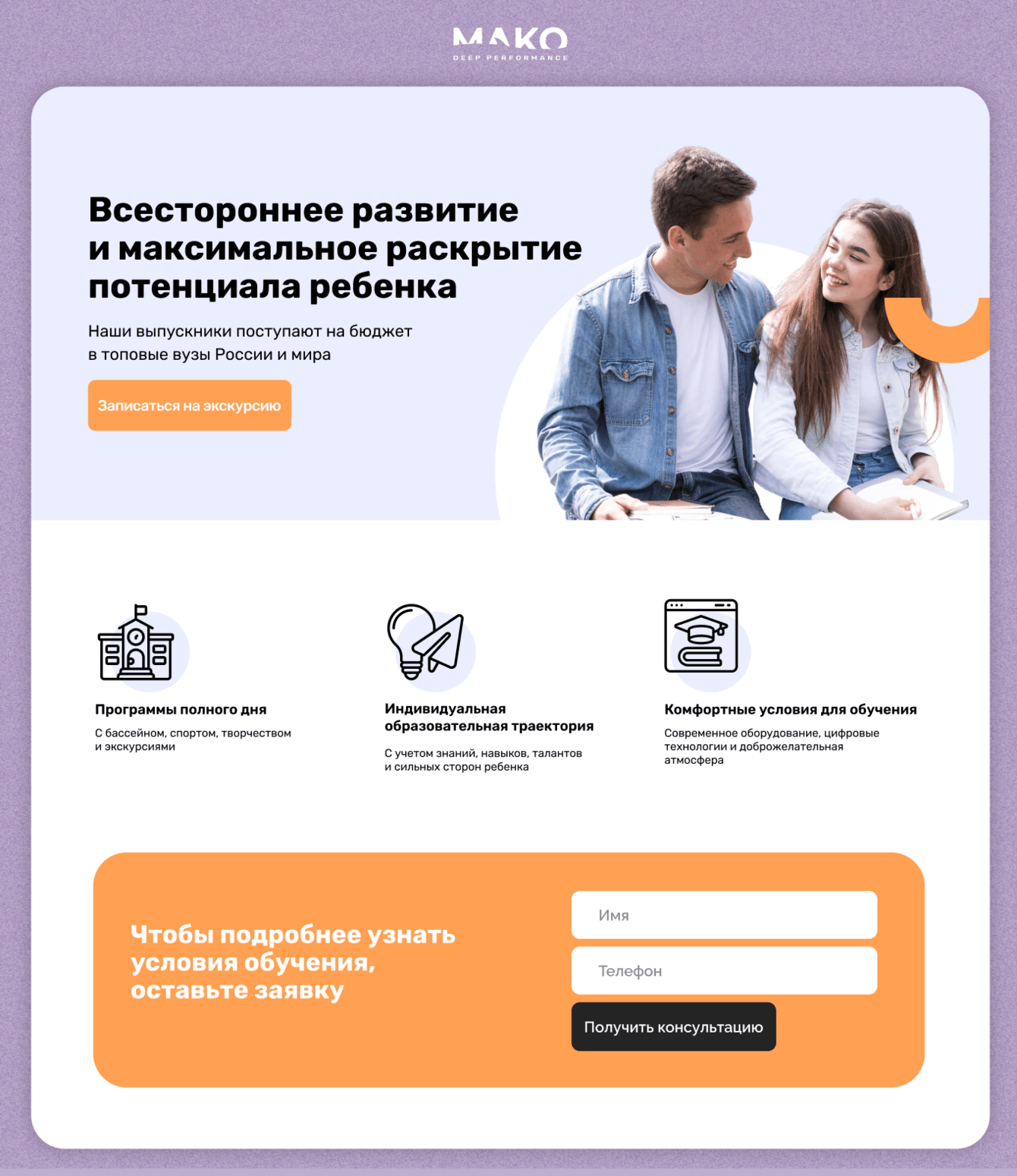 Мы провели CustDev с родителями учеников и на основе полученных данных разработали структуру новых посадочных страниц. Рассказали об уникальных учебных программах, современной инфраструктуре, индивидуальном сопровождении и результатах выпускников.