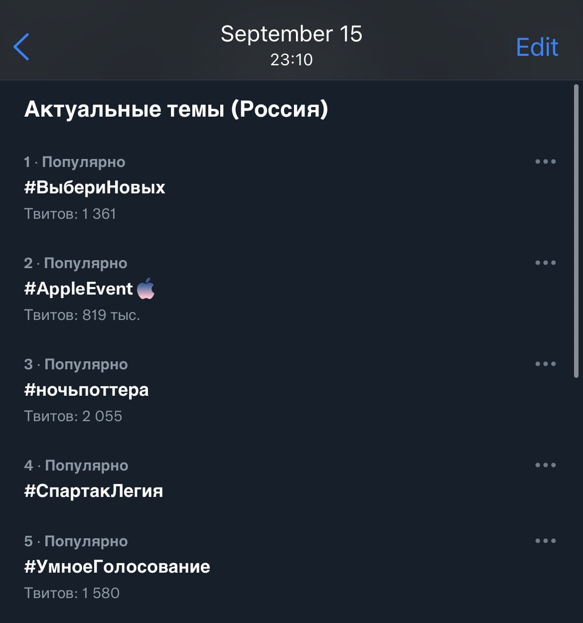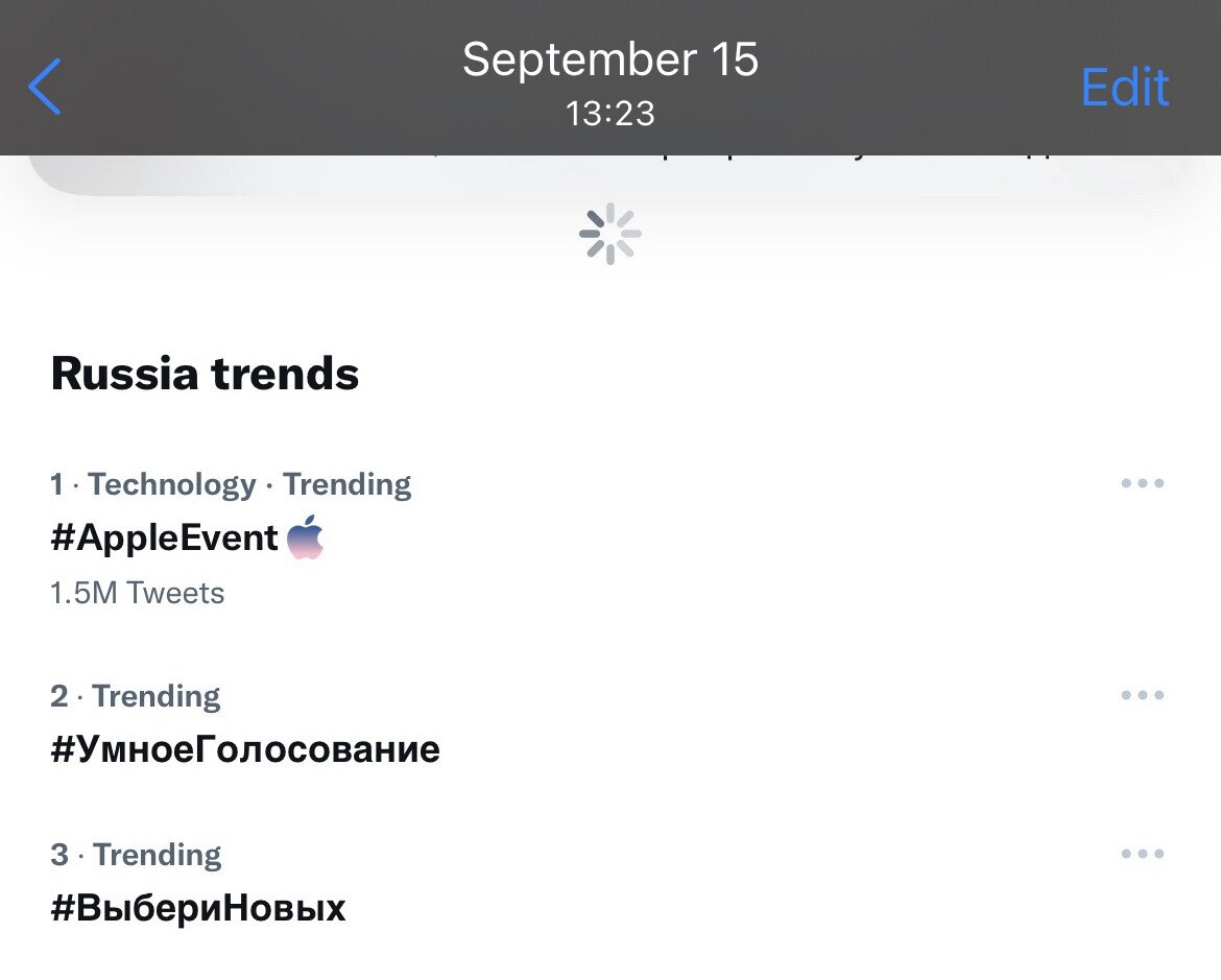И тут к нам приходит новый сюрприз. От надёжного источника мы узнаём, что именно 15 сентября было днём, когда все политические партии боролись за первенство в трендах. Так красиво получилось, что в первой пятёрке трендов (именно она отображается абсолютно всем пользователям Твиттера) продержался только наш хэштег. Напишу от себя, меня больше всего обрадовал обгон Эпловского хештега. Вроде как, самое обсуждаемое событие осени среди каких-то подобных. Занимательно.