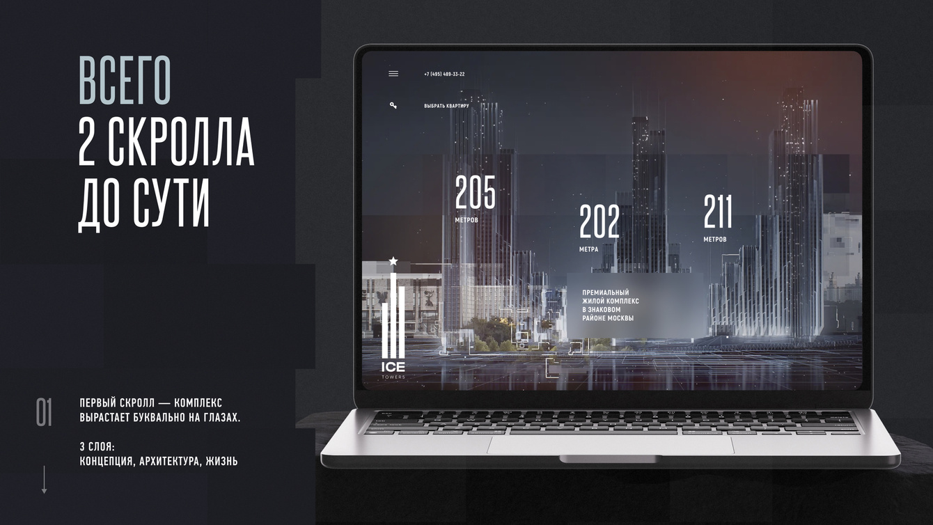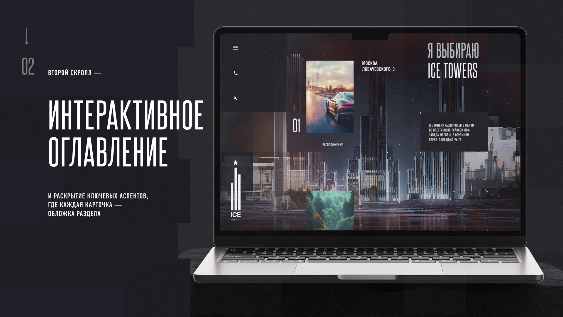 Решая основные задачи (рассказать о проекте, раскрыть преимущества и стимулировать продажи), в творческом порыве мы создали больше чем рабочий инструмент. Сайт ICE TOWERS получился произведением современного искусства. Он обладает яркой образностью при безупречном построении. Сайт с нуля, наполненный динамичной графикой и 3D-анимацией, которые передают эмоцию ICE TOWERS.