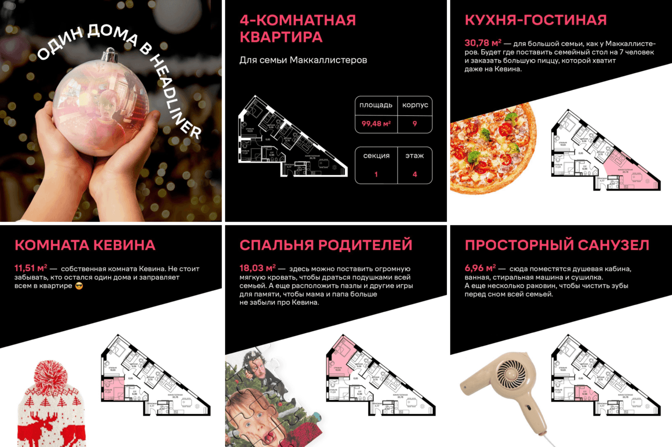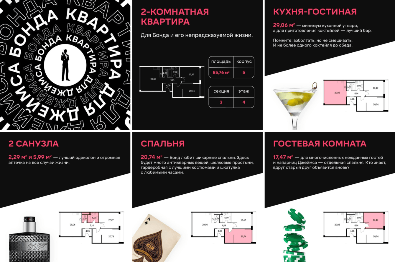 На основе коммуникационной задачи разработали контент-карту: публикации о жителях небоскребов, сотрудниках компании, регулярных мероприятиях и разборы планировок. На последнем остановимся подробнее.