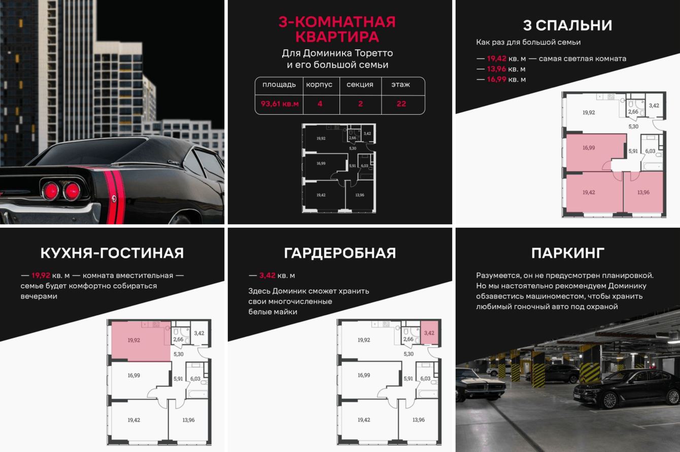 В мае 2021 года вышел «Форсаж 9» — и вместе с ним в интернете появились сотни мемов о персонаже фильма Доминике Торетто и его частых выражениях про семью. Коллеги пошутили, что было бы неплохо разобрать квартиру для необузданного короля улиц и его семьи, а клиент согласился на эту идею. Так появилась первая публикация в новом формате.