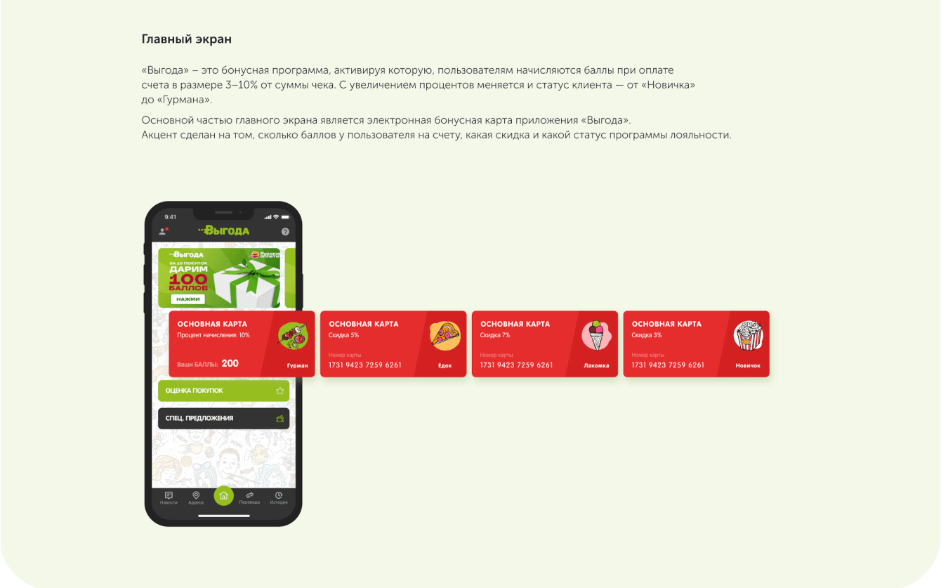 «Выгода» работает как электронная карта, которая накапливает баллы (1 балл = 1 рубль) от заказов в сети киосков «Русский Аппетит», сети кафе «Вермишель».