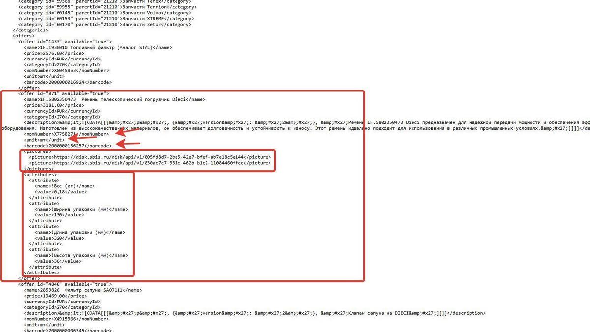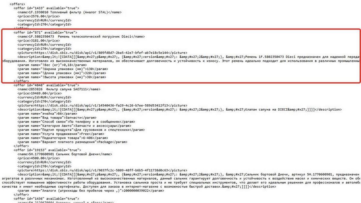 В начале, как и в прошлый раз, мы приступили к получению списка товаров в формате YML. Нам показалось это хорошим решением, ибо можно указать конкретный раздел в СБИС, который необходимо выгружать, и в ответ получить уже структурированный файл со всеми (ну, так описано в документации СБИС) полями. Сделали приложение, запросили, получили данные в таком виде: