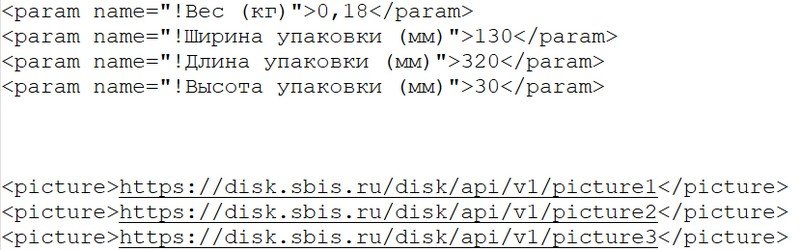Параметры приходят в виде отдельных тэгов, каждый с новой строки. Картинки аналогично: