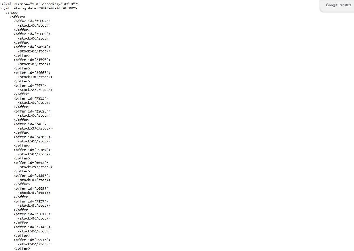 Решением стало получать остатки по каждому товару через тот же обход прайс-листа, описанный выше. Включили параметр balance=true и уже понимая, как обходить все категории в цикле, получили отдельный файл stocks.yml. Связь между файлами идет через id товара. Сопоставляем их и получаем связь: