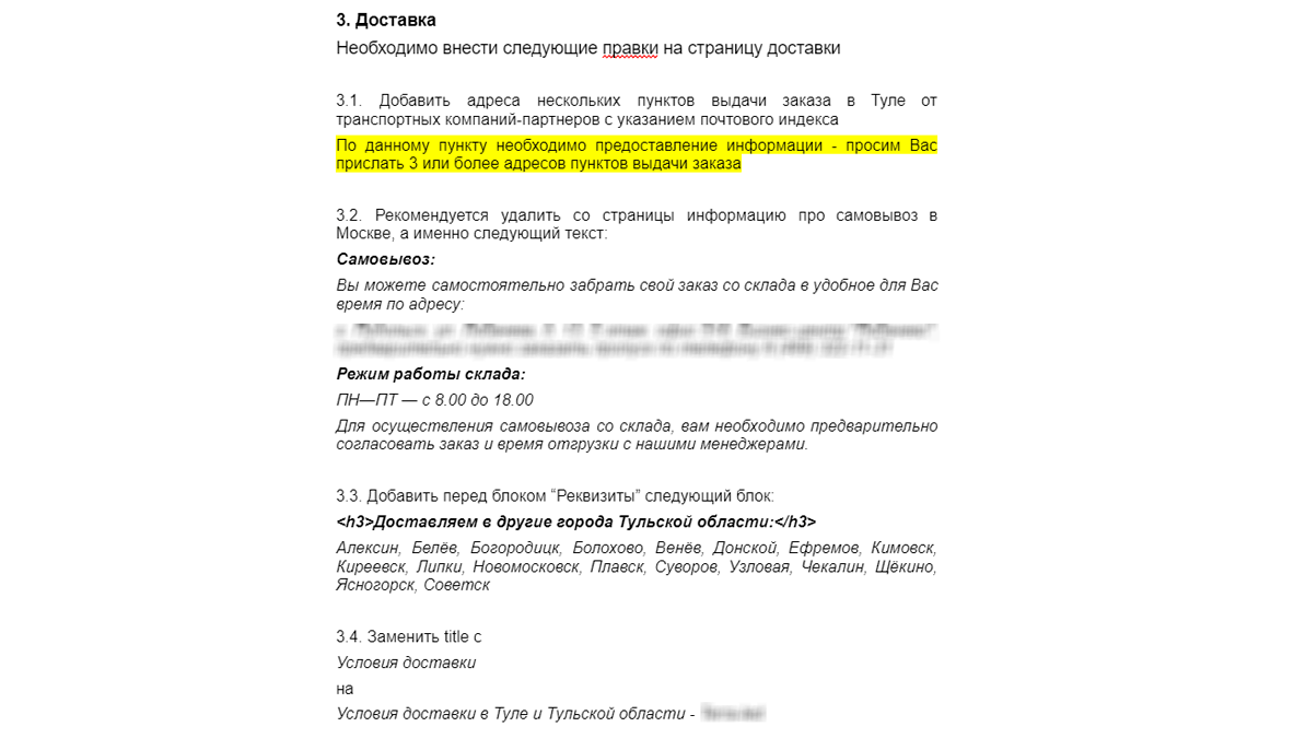 1. Провели работы для улучшения видимости поддоменов для городов-миллионников — добавили региональные контактные данные пунктов выдачи заказов ТК, топонимы в контент. Вот выдержка из рекомендаций для поддомена Тулы: