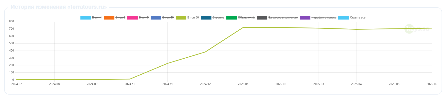 Поскольку сайт представлял собой лендинг, он не индексировался как полноценный сайт с категорией туров, блогом или фильтрами. Мы зафиксировали: