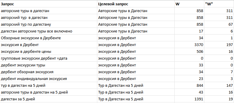 - Разбили ключи на коммерческие (типа «туры в Дагестан на 5 дней») и информационные (например, «что посмотреть в Дагестане летом»);