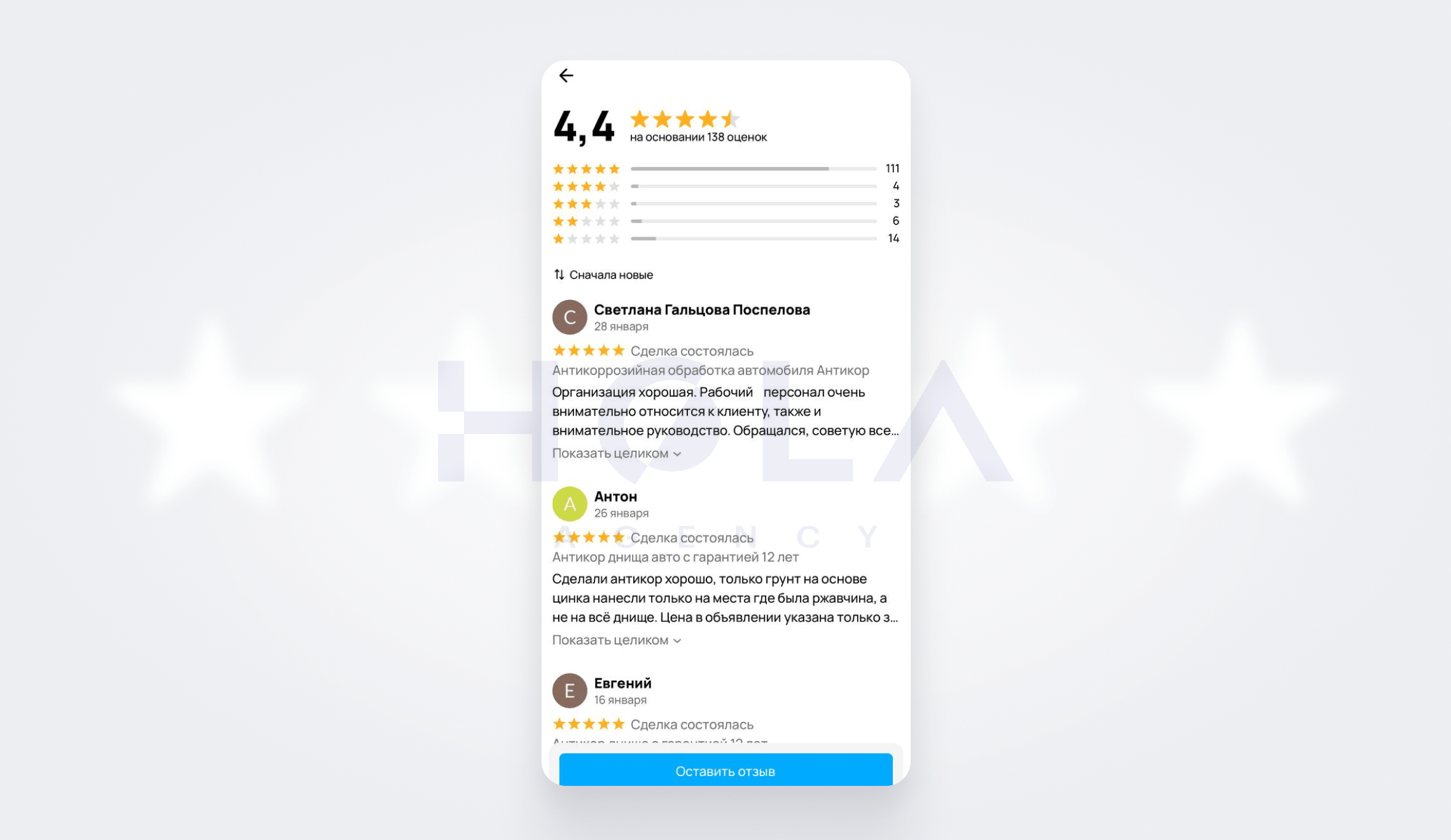 Мы работаем с отзывами следующим образом: авитолог из нашей команды проводит ежедневный мониторинг и уведомляет клиента о поступлении негатива. Каждый негативный отзыв проверяется на достоверность и обжалуется. Если техподдержка Авито находит в отзыве нарушения, то отзыв не публикуется или публикуется без звёзд — такой отзыв невозможно поддержать другим пользователям.