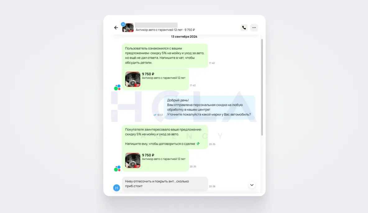 Рассылки спецпредложений — инструмент, позволяющий отправлять потенциальным клиентам, которые добавили объявление в избранное, персональные предложения. В данном случае у клиента все чаты закрыты, так как запись осуществляется только через контакт-центр. Наша команда открывала чат точечно, чтобы увеличить конверсии, и обрабатывала спрос вручную, т.к. отдел продаж не имел возможности вести переписки.