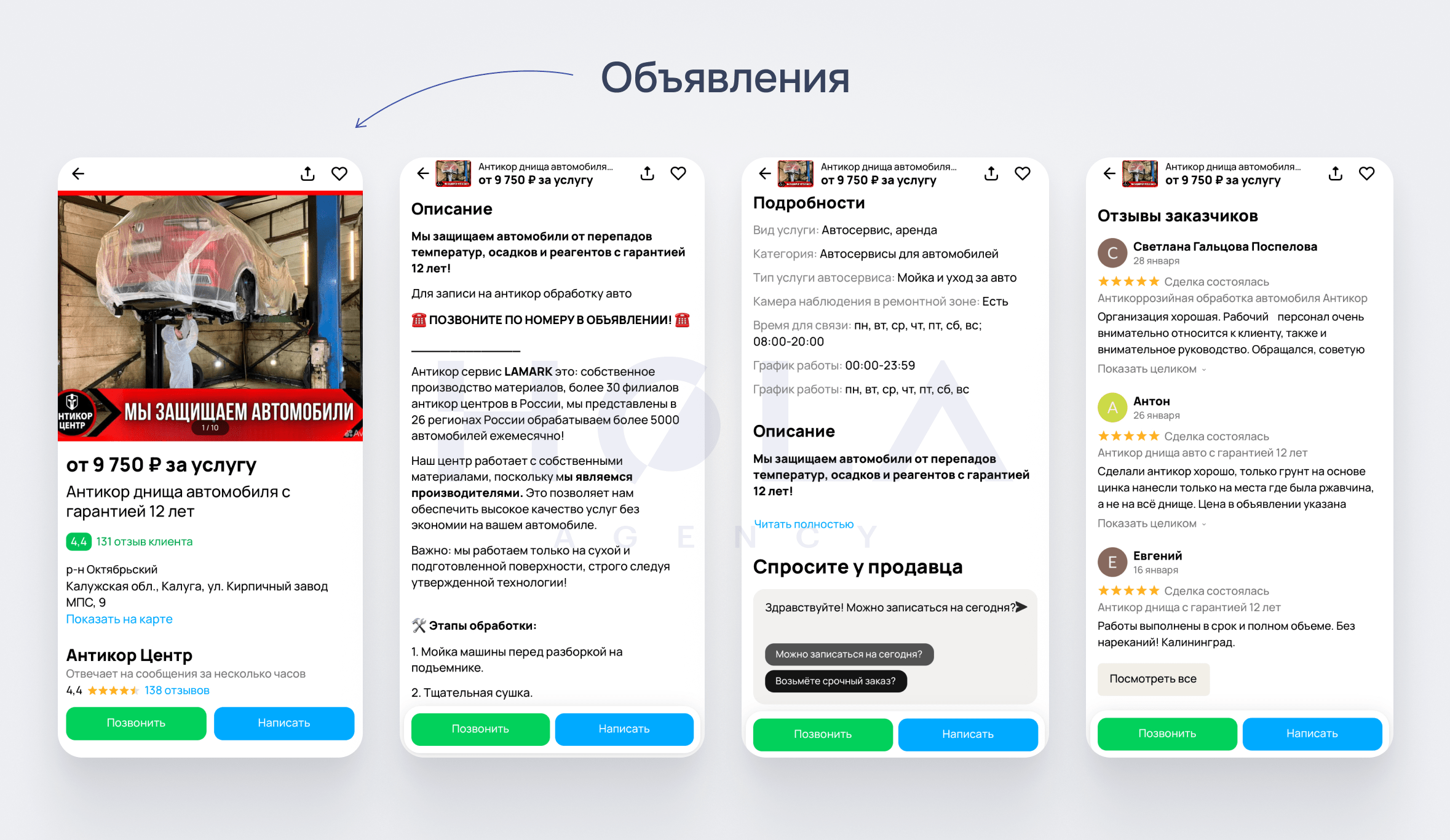 Объявления XL отображаются в поиске в увеличенном формате, включая: (подробное описание (фрагмент текста из объявления); дополнительные фотографии (помимо основной, отображаются ещё две дополнительные фотографии); кнопки для связи («Позвонить» или «Написать», позволяющие пользователям связаться с вами напрямую из результатов поиска). Это делает объявление более привлекательным и удобным для потенциальных клиентов, повышая вероятность отклика.