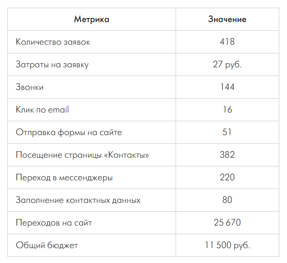 Бюджет в 11 500 рублей был распределен эффективно, что позволило достичь впечатляющего результата — 418 заявок с минимальной стоимостью привлечения 27 рублей за заявку.