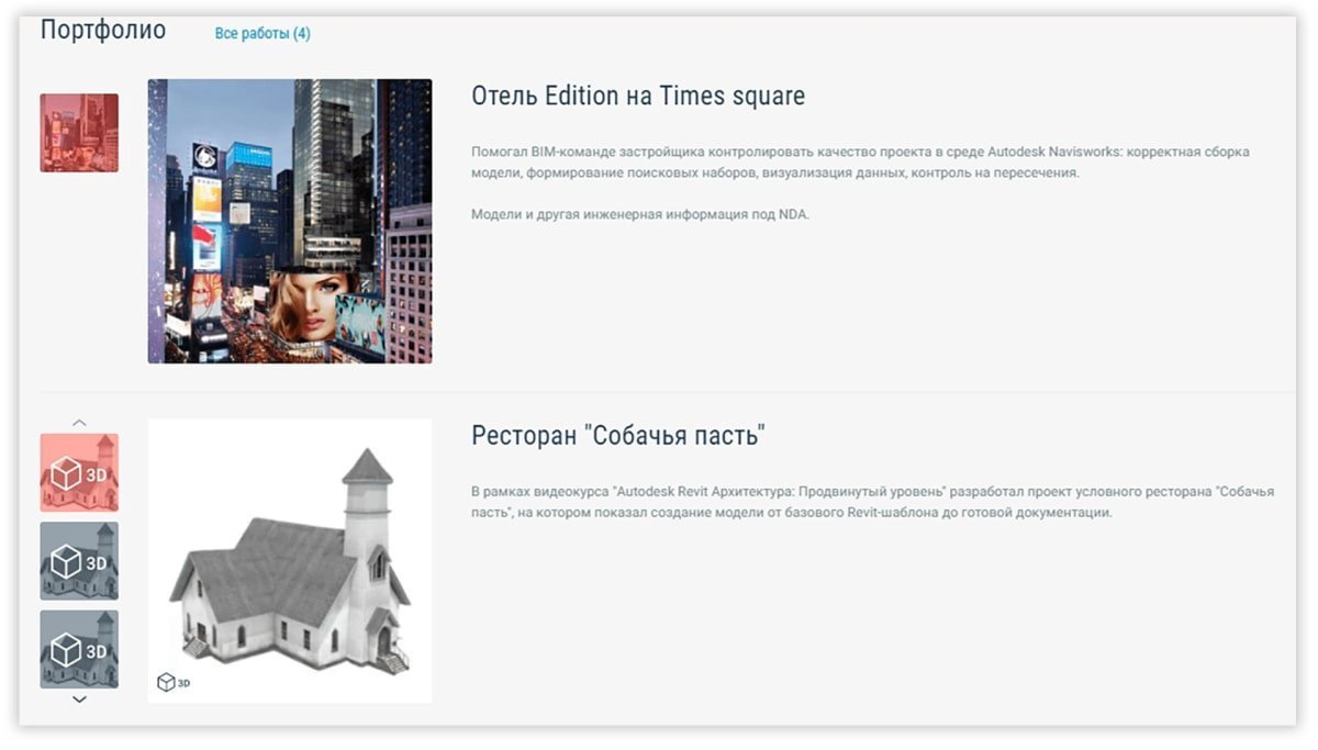 В блок «Портфолио» загружаются не только изображения и описания работ, но и 3D-модели, которые создал специалист.