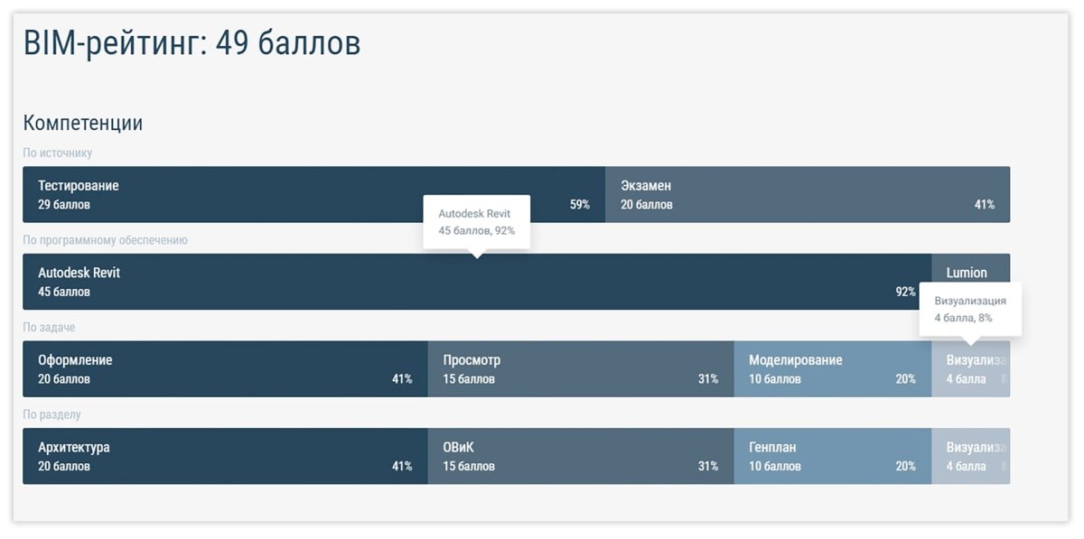Если пользователь успешно проходит тестирование, он получает сертификат. У пользователей также есть открытый профиль «BIM-резюме», где можно посмотреть результаты тестирований, полученные сертификаты, портфолио работ и другие характеристики специалиста. Профиль можно закрыть от публичного просмотра.