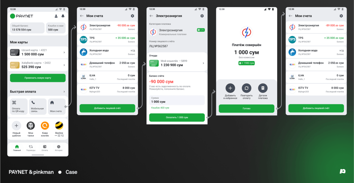 Прежде, чем приступить к редизайну, проанализировали российский и узбекский рынок — изучили принятые в финтех-индустрии механики и показали клиенту референсы, подсвечивая сильные и слабые решения, которые в дальнейшем могли бы применить в приложении Paynet. Также на стадии проработки user flow мы учитывали особенности привычных паттернов поведения пользователя при совершения транзакций в Узбекистане.